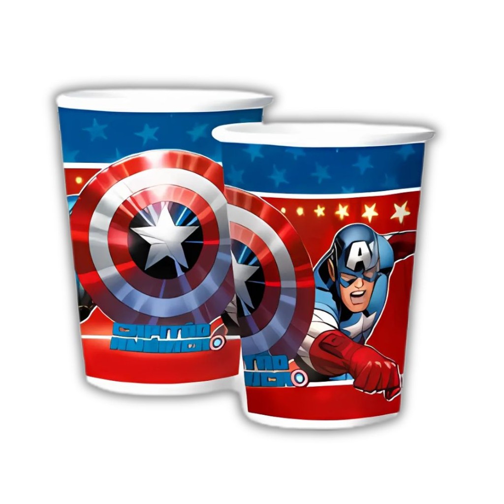 COPO PAPEL 180ML TEMA: CAPITAO AMERICA PODE SER UTILIZADOS EM DECORAÇÃO DE FESTAS E IDEAL PARA SERVIR BEBIDAS. COM UMA EXCELENTE QUALIDADE!! MARCA: REGINA PRODUTO LICENCIADO!