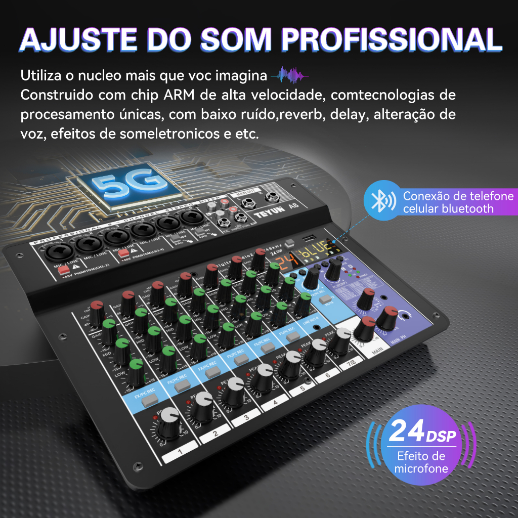 Pacote : Pacote 1 Número do modelo : Audio Mixing Console Tipo : Misturadores Nome da marca : TEYUN Certificado : CE,FCC,ROHS Origem : CN (Origem) TEYUN 8-channel Professional Portable Mixer Sound Mixing Console Entrada de computador 48v Power Modelo Número Certificação Tipo de origem TEYUN A8 Audio Mixing Console Sound Table Board with 8 Channel, USB, Bluetooth, Digital MP3 Computer Input, 48V Phantom Power