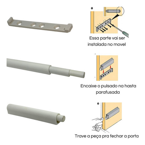 08 peças do Pulsador magnético para 4 (quatro) portas ou gavetas de moveis em gerais. - Material a pronta entrega. - Disponível em duas cores cinza ou branco - Produto com garantia e troca de ate 30 dias Modo de usar: Acionamento por toque na sua porta ou gaveta. Basta uma leve pressão na porta ou gaveta que ela se abre. Material parafusado diretamente no móvel. Acompanha parafusos para instalação. Sem garantia