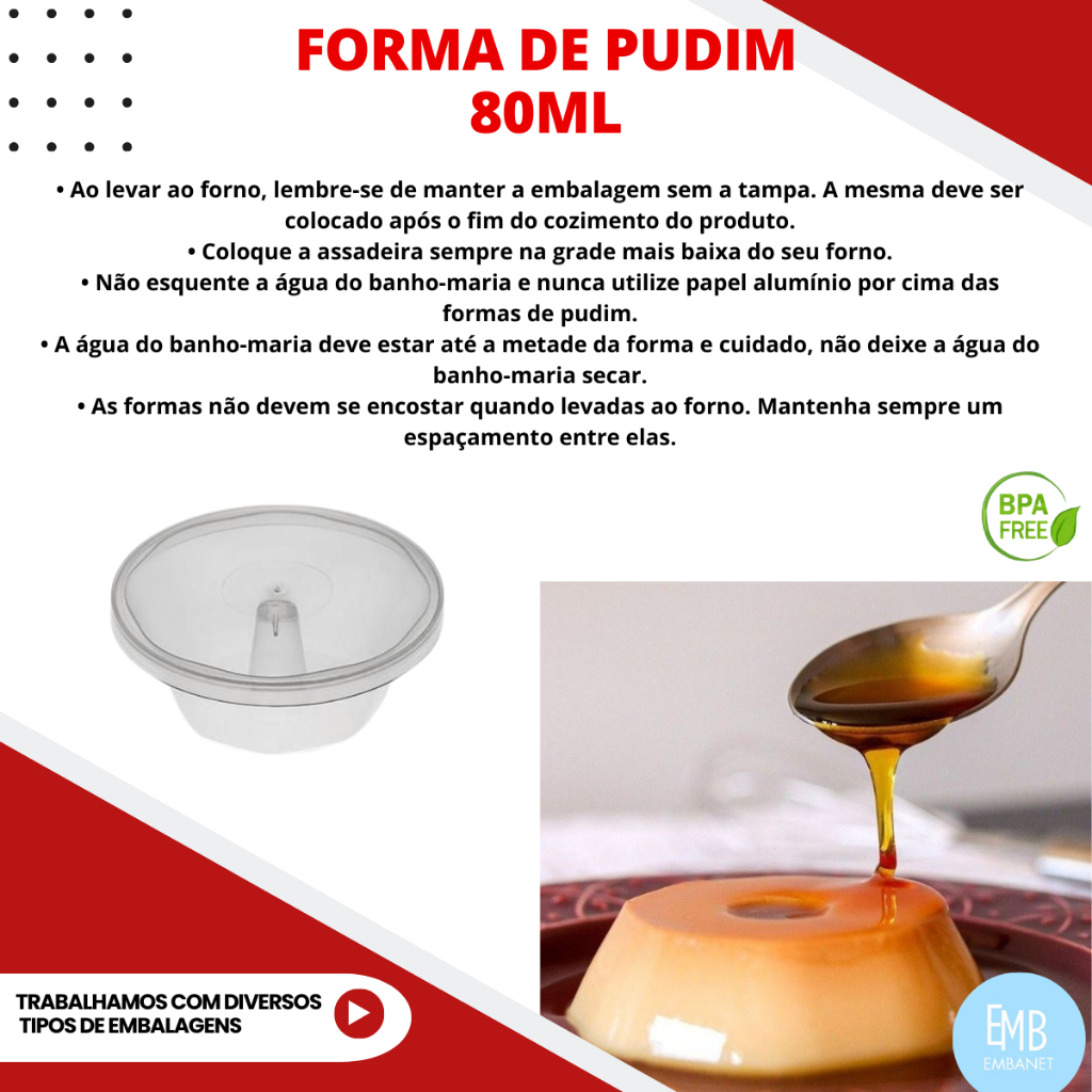 | 80 Formas de Plástico Para Pudim Banho Maria e Forno - 80ml este produto | R$ 57,00 | 28% | 4.8/5 | — |