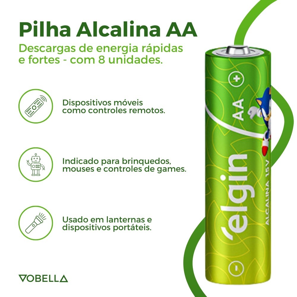 Oii, é um prazer ter você aqui! Cansado de ver seus dispositivos eletrônicos pararem no meio de uma tarefa importante? Se você já teve que interromper uma conversa, assistir a um filme ou até mesmo um jogo porque os dispositivos pararam, você entende a dor da interrupção. As Pilhas Alcalinas AAA Palito Elgin são a solução para manter os seus dispositivos funcionando sem interrupções. O que é: - 80 Pilhas Alcalina Aa. - Marca: Elgin. - Contém: 10 Blisters com 8 unidades cada. - Modelo: Alcalina AAA LRO3. - Pilha Palito. - Voltagem: 1.5 Volts. - NÃO RECARREGÁVEL. O que tem: - Dimensões:44.5 x 10.5 mm. - 0% de Metais Pesados. - Alta Durabilidade. - Economia e Qualidade. Onde usar: - Mouses. - Relógios. - Lanternas. - Teclados sem fio. - Controles de Games. - Fechaduras eletrônicas. - Dispositivos portáteis diversos. - Alguns tipos de controles remotos. Como usar: - Abra o compartimento de pilhas do seu aparelho. - Remova as pilhas antigas, se houver. - Insira as pilhas alcalinas, garantindo que os polos positivo e negativo estejam na posição correta. - Feche o compartimento das pilhas. - Seu aparelho está pronto para uso novamente! Evite interrupções inoportunas e mantenha os seus dispositivos funcionando de forma confiável. Escolha as Pilhas Alcalinas AAA Palito Elgin para garantir energia de longa duração e desempenho constante. Surgiu alguma dúvida? Entre em contato com a gente! Boas Compras :)