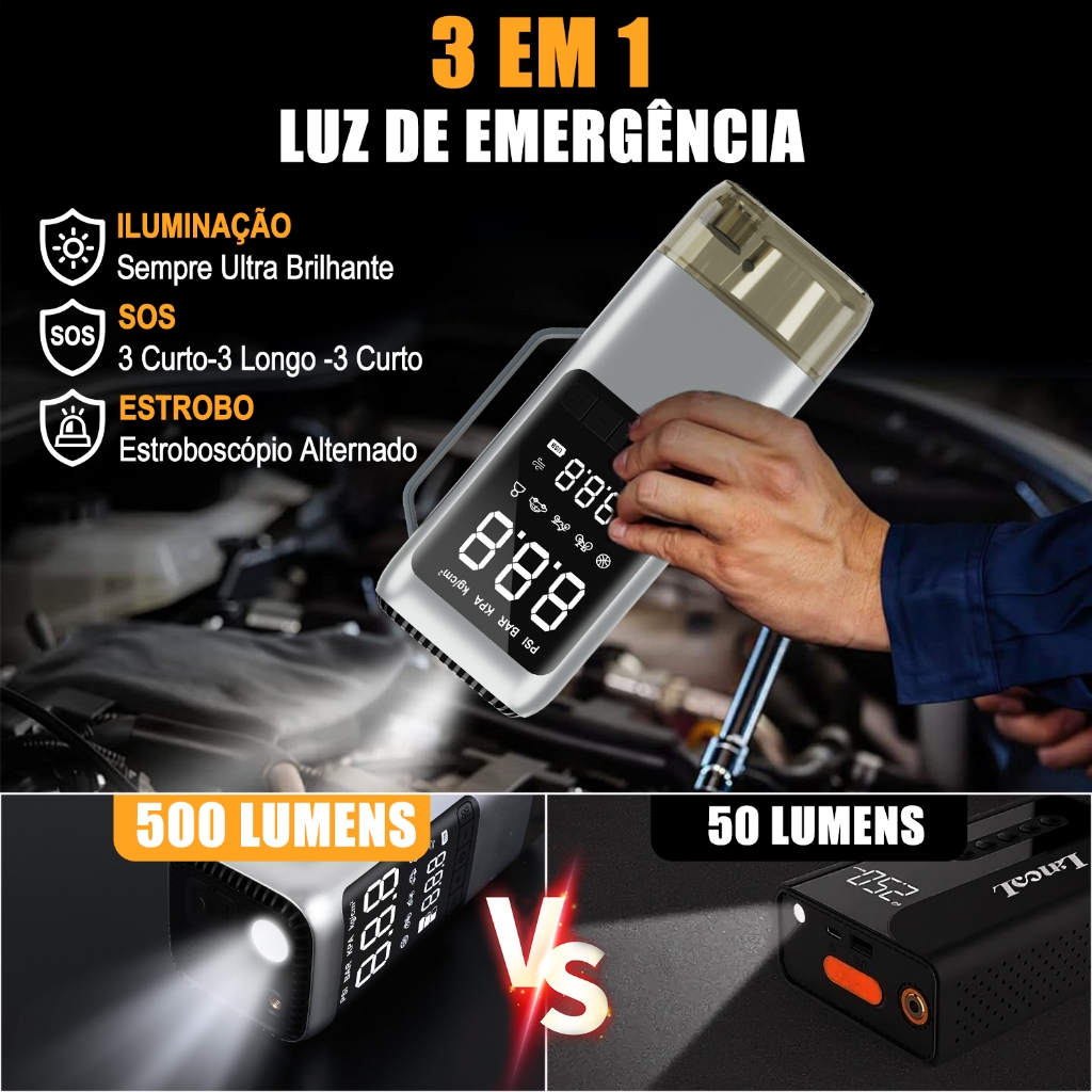 8000 mAh Auxiliar Partida Bateria Carro Moto Com Aspirador Portátil 6 EM 1 MULTIFUNCIONAL Combina partida de emergência, inflador de pneus, bomba de inflação, aspirador de pó, luz LED e carregador portátil em uma unidade compacta. Essa solução multifuncional é uma ferramenta conveniente para emergências na estrada, viagens de acampamento ou manutenção diária do carro. CARREGADOR DE BATERÍA PORTÁTIL Com uma corrente de pico de 1000 A, esse jumpstart pode dar partida nos motores da maioria das motocicletas, carros e caminhões (até 6 L de gasolina / 3 L de diesel). Além de sua alta eficiência, ele tem proteção automática contra altas e baixas temperaturas, subtensão e sobretensão. INFLADOR SEM FIO DE 150 PSI A grande tela de LCD mostra os valores de pressão em tempo real e a pressão predefinida em um piscar de olhos, e 4 bicos diferentes podem ser usados para inflar carros, motocicletas, bicicletas, bolas e muito mais. O valor máximo de pressão do produto pode chegar a 150 PSI, o que pode atender à maioria das necessidades em situações cotidianas. ASPIRADOR DE PÓ PORTÁTIL O aspirador de pó com filtro lavável e motor sem escova oferece uma sucção máxima de 5000Pa, o que permite coletar sem esforço a areia, a poeira e os detritos mais difíceis do carro. Você também pode utilizar a função de sopro da bomba de ar para remover a poeira. Banco de potência e Lanterna LED Um carregador portátil com capacidade de 8000 mAh, com potência de entrada/saída USB tipo-C pode oferecer carregamento rápido para o seu telefone, tablet, relógio etc. A luz LED de 500 lúmens com 3 modos de iluminação o torna um dispositivo de emergência valioso para atividades ao ar livre. BOMBA PARA INFLAR Com uma bomba de ar de alto desempenho com uma vazão de até 350 L por minuto, ela pode inflar vários itens, como balões, anéis de natação, camas de ar e até mesmo funcionar como um soprador de poeira. - Pressão de inflação: 150PSI - Eficiência do ar: 22L/min - Volume máximo de ar: 350L/min - Grau de vácuo: 6500Pa - Capacidade da bateria: 8000mAh(4*2000mAh) - Corrente de pico: 1000A - Tensão de entrada: 5V/2A - Tensão operacional: 14,8V - Pressão da bomba: 10Bar/150PSi - Temperatura de trabalho: -10°C- 45°C - Material da caixa: ABS+PC - Tipo de bateria: Bateria de polímero de lítio de alta qualidade classe A CONTEÚDO DO PACOTE 1* Partida Auxiliar 1* Cabo de partida com clipe 1* Cabo USB 1* Tubo de bombeamento 3* Bicos de ar 1* Acessórios do aspirador de pó 1* Saco de armazenamento 1* Manual do usuário Garantia do vendedor: 3 meses