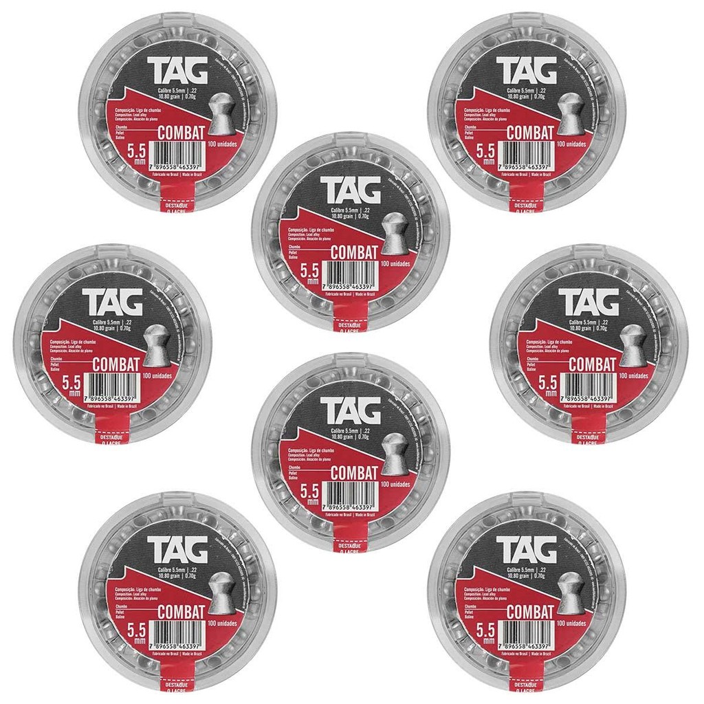 Produto de uso exclusivo em práticas esportivas. Esse é o Chumbinho da marca TAG modelo COMBAT cuja aerodinâmica entrega excelente poder de impacto e penetração. Compatível especificamente com Armas de pressão que tenham calibre 5.5mm (.22). Seu design de cabeça redonda com saia lisa o torna a opção perfeita para atiradores que buscam uma munição versátil e com ótimo custo benefício. ESPECIFICAÇÕES TÉCNICAS: - Marca: Tag - Calibre: 5.5mm (.22) - Modelo: Combat - Material: Chumbo - Quantidade: 100 Unidades - Peso: 0.70 gramas - Gramatura: 10.80 grains - Comprimento unitário: 5,9mm - Peso total de cada embalagem: 87 gramas ITENS INCLUSOS: - 08 Chumbinho Tag Combat 5.5mm 100un. Observação: Garantia de 03 meses mediante defeitos de fábrica. INFORMAÇÃO: Os equipamentos, peças e acessórios aqui listados são de uso exclusivo em armas de pressão (gás comprimido ou mola), airsoft, paintball, esferas plásticas (BBS) e estão em conformidade com a legislação brasileira de USO PERMITIDO "É permitido o uso de armas de pressão por ação de gás comprimido ou por ação de mola, com calibre igual ou inferior a seis milímetros (6mm ou 6.0mm), e das que lançam esferas de plástico com tinta, como os lançadores de paintball." Conforme parágrafo único do Art. 11 do DECRETO Nº 11.615, DE 21 DE JULHO DE 2023. A venda desses itens é feita somente para maiores de 18 anos mediante a comprovação de maior idade. Atenção: O envio de Armas de pressão e Airsoft é realizado somente por transportadora. Caso tenham dúvidas entrar em contato.