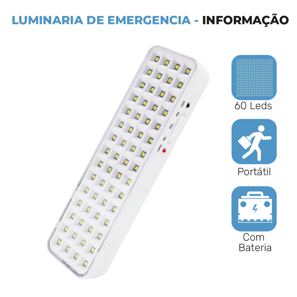 🌟 Luminárias de Emergência com LED 🌟 ✨ 30 LEDs ✨ 💡 Potência: 2W 🌟 Cor: Branco Frio (6500K) 🎨 IRC: >70 🔋 Corrente: 5mA (110V) / 25mA (220V) - Máx: 10mA (110V) / 30mA (220V) ⚡ Frequência: 50/60Hz 🔆 Lúmen: 50LM (Mín) / 100LM (Máx) 🔋 Bateria: Lítio 500mAh - 3.7V ⏳ Duração da Bateria: Fluxo Mínimo 3h / Fluxo Máximo 5h 🔌 Tensão: 100-240V 📐 Ângulo de Abertura: 120° ⏳ Vida Útil: 10.000H ⚖️ Peso: 90g 🌟 60 LEDs 🌟 💡 Potência: 5W 🌟 Cor: Branco Frio (6500K) 🎨 IRC: >70 🔋 Corrente: 25mA (100V) / 50mA (240V) - Máx: 30mA (100V) / 60mA (240V) ⚡ Frequência: 50/60Hz 🔆 Lúmen: 400LM (80Lm/W) 🔋 Bateria: Lítio 1200mAh - 3.7V ⏳ Duração da Bateria: Fluxo Mínimo 6h / Fluxo Máximo 3h 🔌 Tensão: 100-240V 📐 Ângulo de Abertura: 120° ⏳ Vida Útil: 10.000H 🔹 Escolha a Luminária Ideal para suas Necessidades! 🔹 ⚠ O ANÚNCIO SE REFERE A UM KIT DE 8 a 12 LUMINÁRIAS! ESCOLHA DE ACORDO COM SUA PREFERÊNCIA EM NOSSAS VARIAÇÕES DE QUANTIDADE!