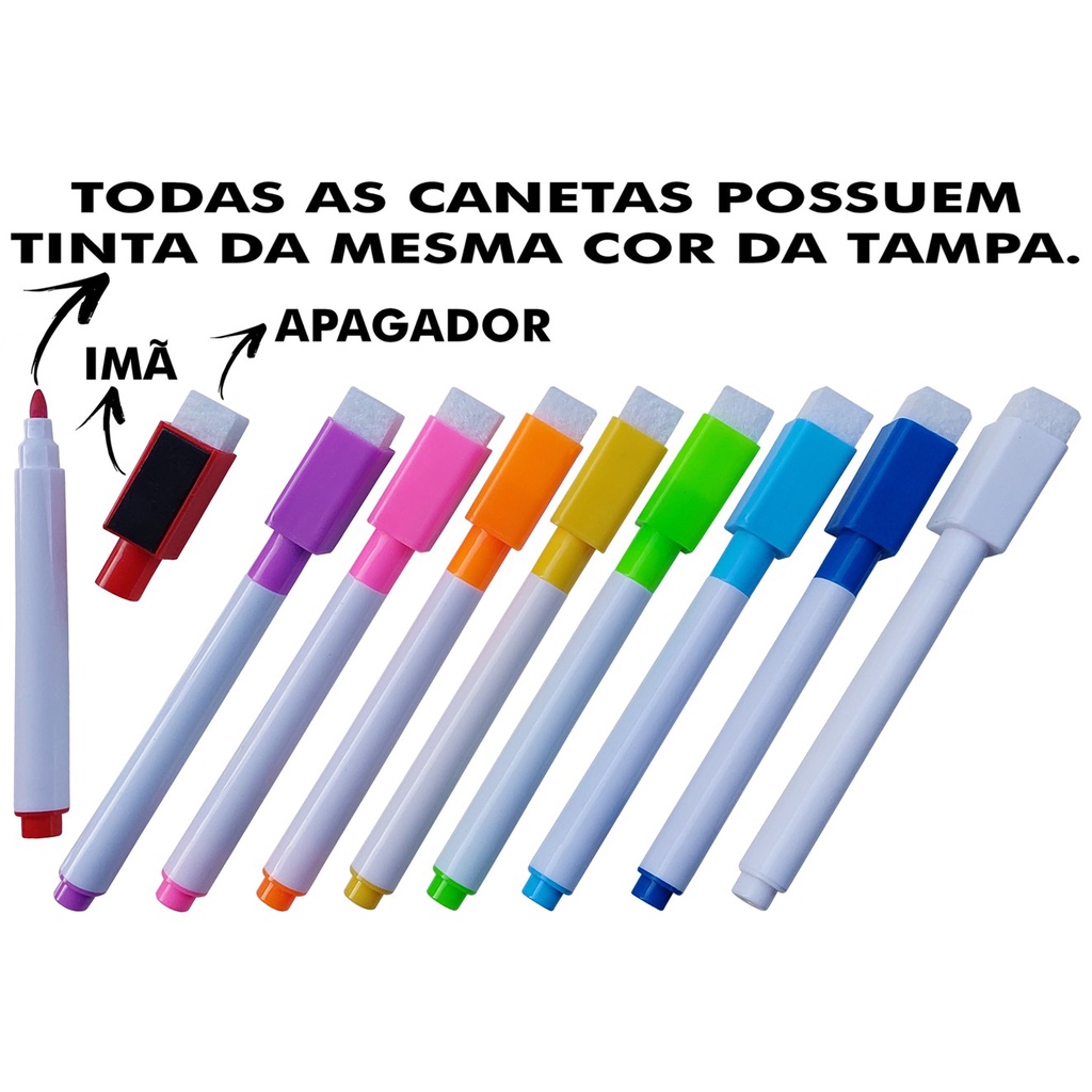 As canetas podem ser usadas em quadro preto, em vidros e em outras superfícies lisas, na ponta da tampa encontra-se uma espuma para apagar e na lateral um imã que permite que grudem em superfícies metálicas. Recomendamos apagar somente após a tinta estar totalmente seca, caso necessário utilizar um pano úmido. Contém:• 9 Canetas giz líquido 11x1cm com apagador e imã na tampa nas cores: vermelho, lilas, rosa, laranja, amarelo, verde, azul claro, azul escuro e branco (1 caneta de cada cor).Trabalhamos com produtos novos a pronta entrega.