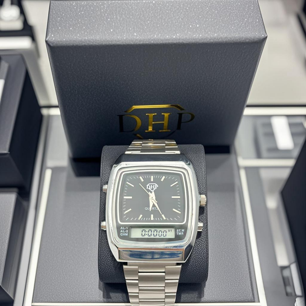 Relógio original, direto da fábrica, com garantia de preço e qualidade. Adicione um toque de sofisticação ao seu look com o Relógio DHP. Ideal para qualquer ocasião, ele combina um design moderno com materiais de alta qualidade. Perfeito para se presentear ou surpreender alguém especial, este relógio é uma peça linda e charmosa, ideal para qualquer ocasião. Marca: DHP Interface: Analógico/Digital Estilo: Negócios Diâmetro: 36mm Material: Metal Alarme: Sim Data: Não Luz: Sim Cronômetro: Sim Resistencia à água: Sim Gênero: Feminino Fecho: Expansível Caixinha de brinde.