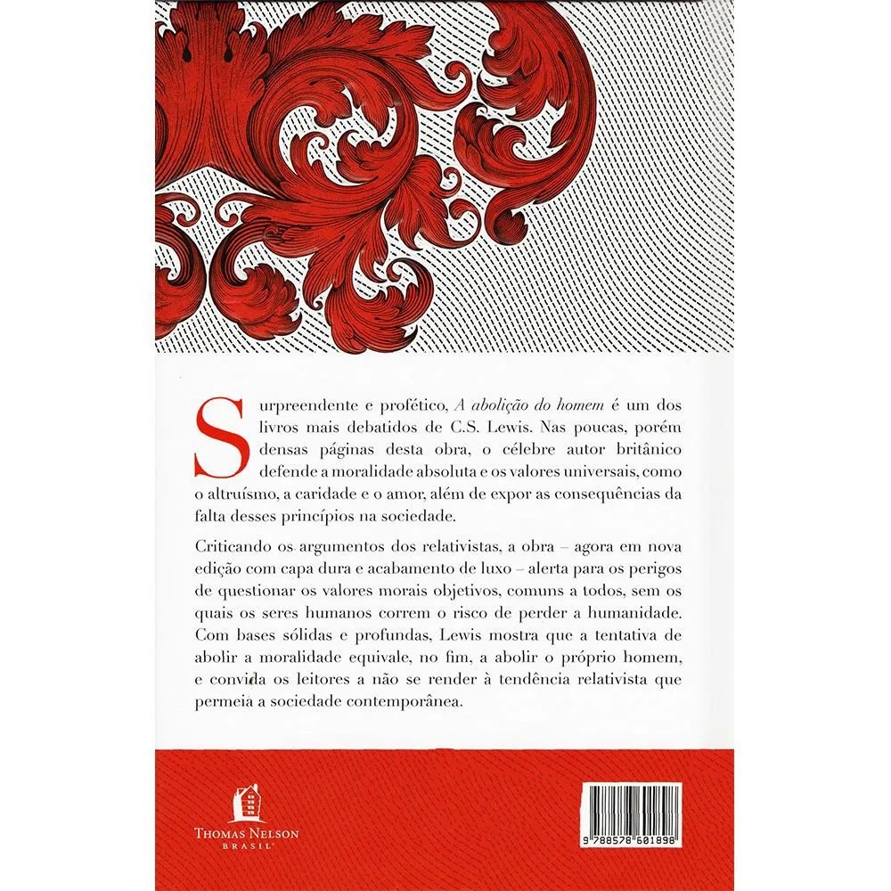 Surpreendente e profético, A abolição do homem é um dos livros mais debatidos de C.S. Lewis. Nas poucas, porém densas páginas desta obra, o célebre autor britânico defende a moralidade absoluta e os valores universais, como o altruísmo, a caridade e o amor, além de expor as consequências da falta desses princípios na sociedade. Criticando os argumentos dos relativistas, a obra – agora em nova edição – alerta para os perigos de questionar os valores morais objetivos, comuns a todos, sem os quais os seres humanos correm o risco de perder a humanidade. Com bases sólidas e profundas, Lewis mostra que a tentativa de abolir a moralidade equivale, no fim, a abolir o próprio homem, e convida os leitores a não se render à tendência relativista que permeia a sociedade contemporânea. Editora: Thomas Nelson Brasil Acabamento: Capa Dura Número de Páginas: 128 Dimensões: 14 larg. x 21 alt.