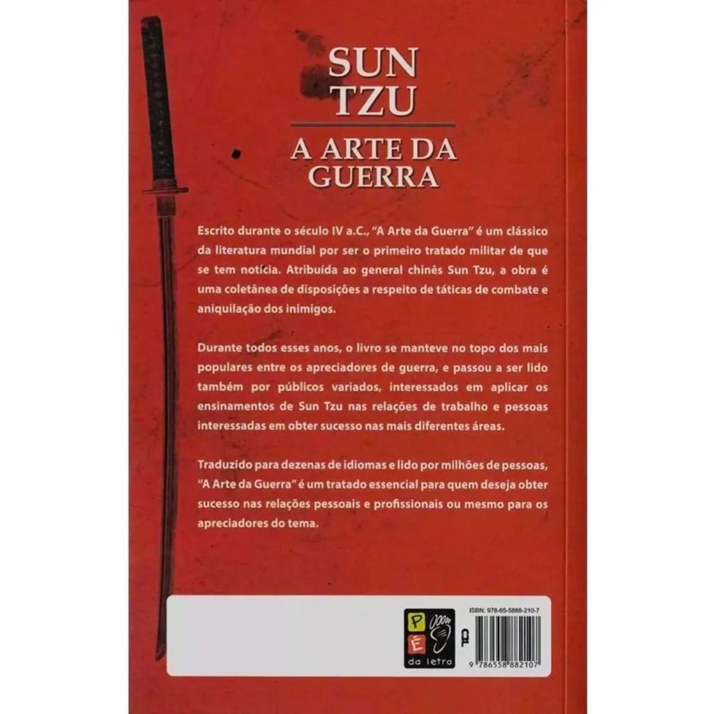 A arte da guerra" é um clássico da literatura mundial por ser o primeiro tratado militar de que se tem noticia. Atribuída ao general chinês Sun Tzu, a obra é uma coletânea de disposições a respeito de táticas de combate e aniquilação dos inimigos. Durante todos esses anos, o livro se manteve no topo dos mais populares entre os apreciadores de guerra, e passou a ser lido também por públicos variados, interessados em aplicar os ensinamentos de Sun Tzu nas relações de trabalho e pessoas interessadas em obter sucesso em diferentes áreas. Traduzido para dezenas de idiomas, é um tratado essencial para quem deseja obter sucesso nas relações pessoais e profissionais ou mesmo para os apreciadores do tema. Versão trilíngue: português, inglês e espanhol. Título: A Arte da Guerra Autor: Sun Tzu Número de páginas: 248 Dimensões: 14 cm larg. x 21 cm alt. Acabamento: Capa brochura Editora: Pé da Letra