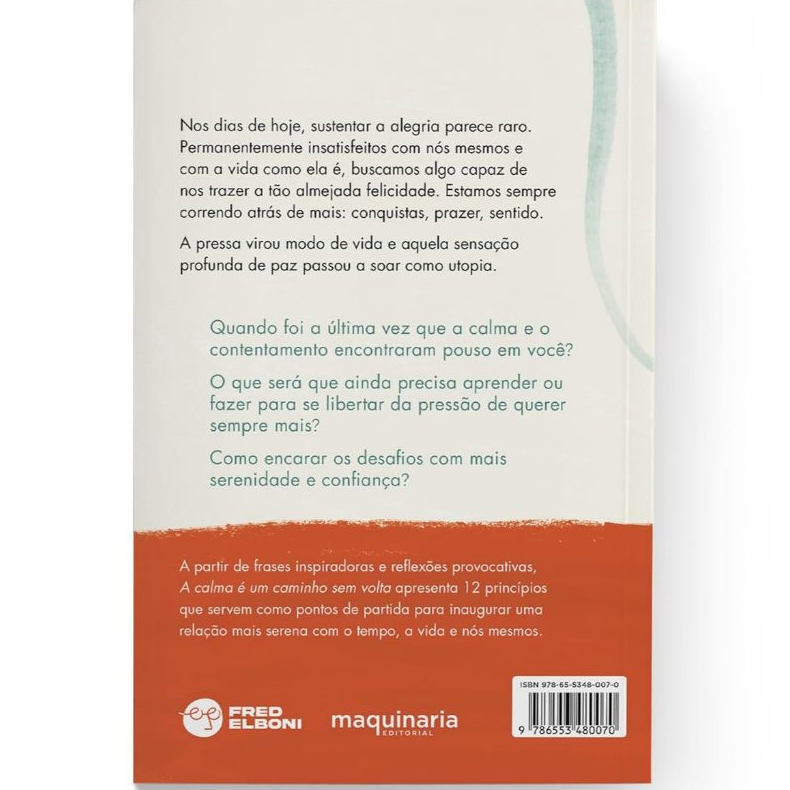 📝 Descrição: A Calma É Um Caminho Sem Volta, de Fred Elboni, é uma obra sensível e provocadora que convida o leitor a desacelerar e cultivar uma vida mais consciente e serena. Inspirado por sua própria trajetória, o autor apresenta 12 princípios que ajudam a enfrentar a ansiedade, o excesso de performance e a desconexão emocional. Entre os temas abordados estão: • A importância do silêncio e da presença • O valor da simplicidade e do desapego • A construção de vínculos saudáveis • A prática da autorresponsabilidade e do amor-próprio Com projeto gráfico refinado e ilustrações de Valentina Fraiz, o livro é ideal para quem busca leveza, profundidade e autenticidade em sua jornada pessoal. 📄 Ficha técnica: Título: A Calma É Um Caminho Sem Volta Autor: Fred Elboni Editora: Maquinaria Editorial ISBN: 9786553480070 Idioma: Português Número de páginas: 240 Formato: Brochura Dimensões: 20,5 cm x 13,7 cm Peso: 200 g Categoria: Autoajuda, saúde emocional, bem-estar Indicação etária: A partir de 16 anos 🔍 Palavras-chave: a calma é um caminho sem volta, fred elboni, maquinaria editorial, livro de bem-estar, saúde emocional, desaceleração, vida com propósito, autoajuda, simplicidade, paz interior