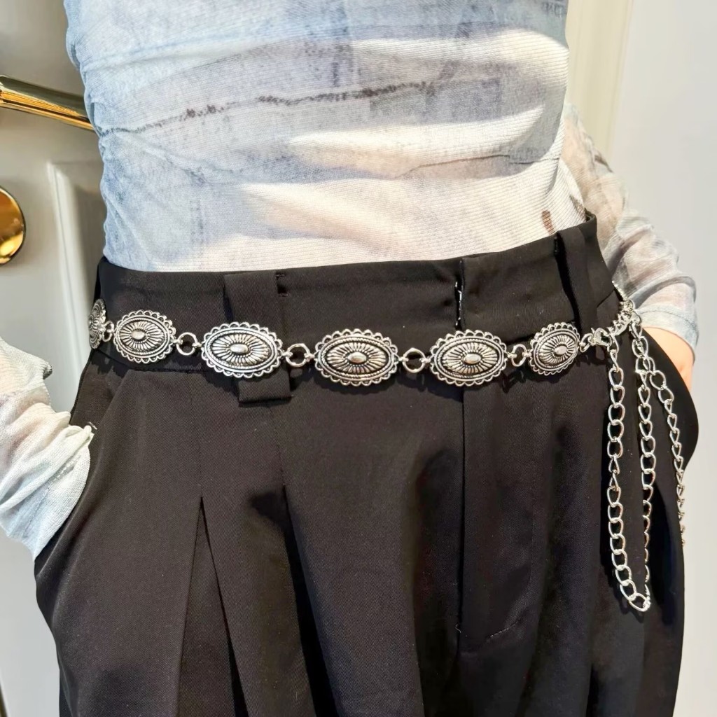 A-Cinto feminino retro prata estilo nacional esculpida decoração de flores cintura corrente carnaval
