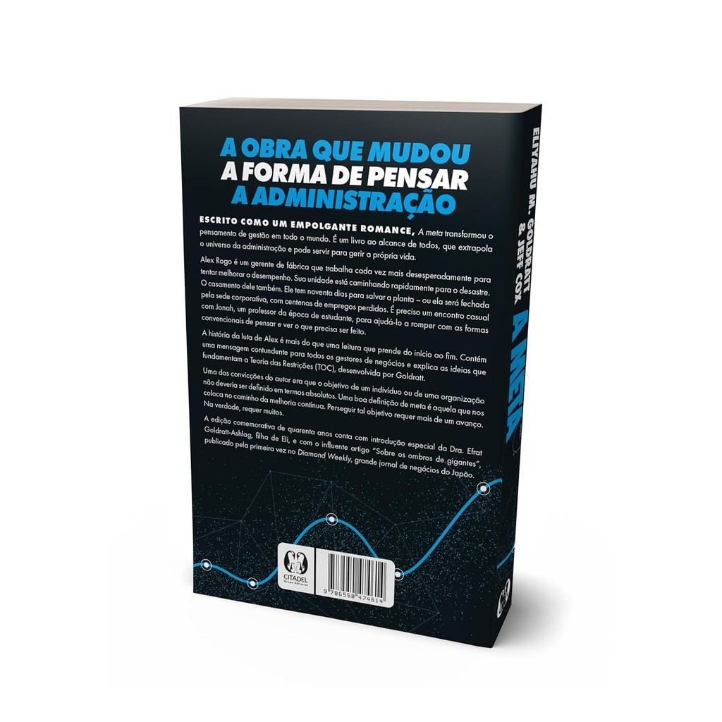 A OBRA QUE MUDOU A FORMA DE PENSAR A ADMINISTRAÇÃO. Escrito como um empolgante romance, A meta transformou o pensamento de gestão em todo o mundo. É um livro ao alcance de todos, que extrapola o universo da administração e pode servir para gerir a própria vida. Alex Rogo é um gerente de fábrica que trabalha cada vez mais desesperadamente para tentar melhorar o desempenho. Sua fábrica está caminhando rapidamente para o desastre. O casamento dele também. Ele tem noventa dias para salvar sua unidade – ou ela será fechada pela sede corporativa, com centenas de empregos perdidos. É preciso um encontro casual com Jonah, um professor da época de estudante, para ajudá-lo a romper com as formas convencionais de pensar e ver o que precisa ser feito. A história da luta de Alex para salvar sua fábrica é mais do que uma leitura que prende do início ao fim. Contém uma mensagem contundente para todos os gestores de negócios e explica as ideias que fundamentam a Teoria das Restrições (TOC), desenvolvida por Goldratt. Uma das convicções do autor era que o objetivo de um indivíduo ou de uma organização não deveria ser definido em termos absolutos. Uma boa definição de meta é aquela que nos coloca no caminho da melhoria contínua. Perseguir tal objetivo requer mais de um avanço. Na verdade, requer muitos. A edição comemorativa de quarenta anos conta com introdução especial da Dra. Efrat Goldratt-Ashlag, filha de Eli, e com o influente artigo “Sobre os ombros de gigantes”, publicado pela primeira vez no Diamond Weekly, grande jornal de negócios do Japão. 23x16 cm 384 Páginas