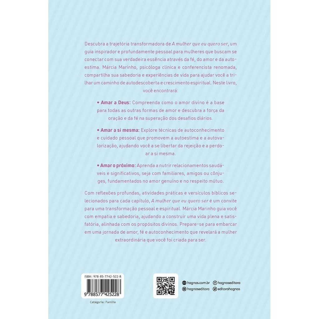 Descubra a trajetória transformadora de A mulher que eu quero ser, um guia inspirador e profundamente pessoal para mulheres que buscam se conectar com sua verdadeira essência através da fé, do amor e da autoestima. Márcia Marinho, psicóloga clínica e conferencista renomada, compartilha sua sabedoria e experiências de vida para ajudar você a trilhar um caminho de autodescoberta e crescimento espiritual. Neste livro, você encontrará: • Amar a Deus: Compreenda como o amor divino é a base para todas as outras formas de amor e descubra a força da oração e da fé na superação dos desafios diários.• Amar a si mesma: Explore técnicas de autoconhecimento e cuidado pessoal que promovem a autoestima e a autovalorização, ajudando você a se libertar da rejeição e a perdoar a si mesma.• Amar o próximo: Aprenda a nutrir relacionamentos saudáveis e significativos, seja com familiares, amigos ou cônjuges, fundamentados no amor genuíno e no respeito mútuo. Com reflexões profundas, atividades práticas e versículos bíblicos selecionados para cada capítulo, A mulher que eu quero ser é um convite para uma transformação pessoal e espiritual. Márcia Marinho guia você com empatia e sabedoria, ajudando a construir uma vida plena e satisfatória, alinhada com os propósitos divinos. Prepare-se para embarcar em uma jornada de amor, fé e autoconhecimento que revelará a mulher extraordinária que você foi criada para ser. 16x23cm 224 Páginas