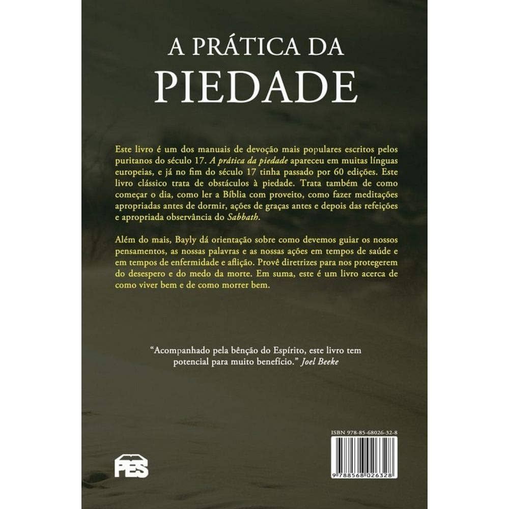 A Prática da Piedade é um livro com manual de devoção escritos pelos puritanos do século 17. A Prática da Piedade apareceu em muitas cidades europeias, e no fim do século 17 tinha atingido 60 edições. O livro trata de obstáculos à piedade. Trata-se também de como começar o dia, com ler a Bíblia com proveito, como fazer meditações apropriadas antes de dormir, ações de graças antes e depois das refeições e apropriada observância do Sabbath. O autor Lewis Bayly oferece instruções sobre como devemos guiar os nossos pensamentos, as nossas palavras e as nossas ações em tempos de saúde e tem tempos de enfermidades e aflição. O autor fornece procedimentos para nos protegerem do desespero e do medo da morte. Em suma, este é um livro acerca de como viver bem e de como morrer bem Título: A Prática da Piedade Subítulo: Diretrizes para o cristão andar de modo que possa gradar a Deus Autor: Lewis Bayly Páginas: 382 Formato: 23 x 16 x 1 Capa: Brochura Peso: 0,550 g ISBN: 9788568026328 Editora: PES