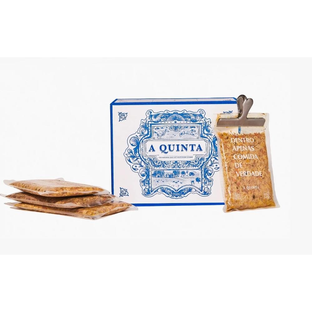 Menu das Estações Alimento completo e balanceado, opção para cães adultos e idosos de todas as raças, elaborada com ingredientes da estação. Altamente palatável e nutritiva. Composição BásicaCarne Bovina 40% (coração e fígado), Arroz Parboilizado, Cenoura, Batata Doce, Abóbora (orgânica), Ervilha, Óleo de Canola, Fosfato Bicálcico, Cloreto de Colina, Açafrão, Suplemento Vitamínico Mineral A Quinta (sulfato de cobre, iodato de cálcio, sulfato de ferro, sulfato de manganês, zinco aminoácido quelato, selenito de sódio, sulfato de zinco, biocolina, vitamina A, vitamina D3, vitamina E, vitamina B1, vitamina B2, vitamina B6, vitamina B12, vitamina C, biotina, vitamina K3, ácido pantotênico, niacina, ácido fólico), Salsinha (orgânica), Cloreto de Sódio (Sal Comum), Magnésio Quelato, Óleo de Peixe, Cloreto de Potássio, Carbonato de Cálcio, Pimenta do Reino. Possíveis substitutivos: Coração suína, língua suína, fígado suíno, abóbora menina, batata doce branca, arroz agulhinha, manjericão, hortelã, orégano.