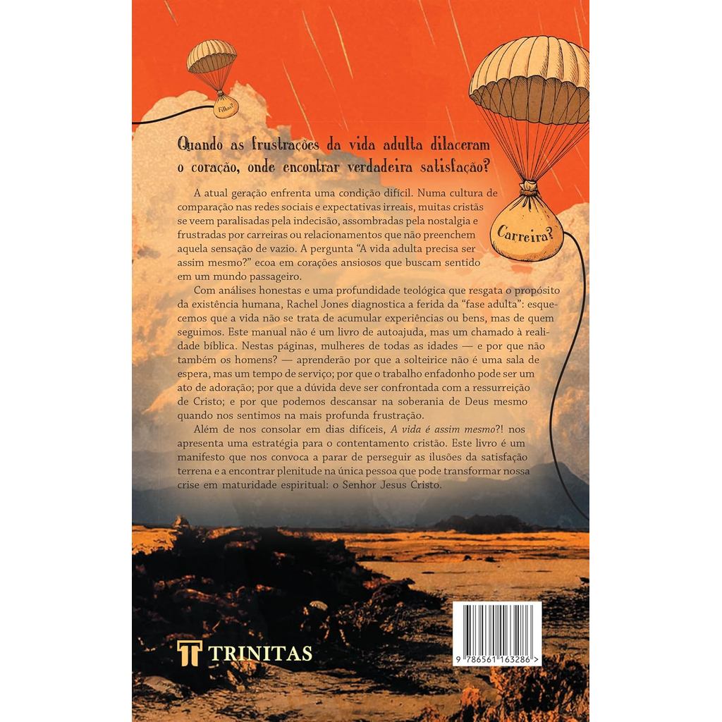Quando as frustrações da vida adulta dilaceram o coração, onde encontrar verdadeira satisfação? A atual geração enfrenta uma condição difícil. Numa cultura de comparação nas redes sociais e expectativas irreais, muitas cristãs se veem paralisadas pela indecisão, assombradas pela nostalgia e frustradas por carreiras ou relacionamentos que não preenchem aquela sensação de vazio. A pergunta “A vida adulta precisa ser assim mesmo?” ecoa em corações ansiosos que buscam sentido em um mundo passageiro. Com análises honestas e uma profundidade teológica que resgata o propósito da existência humana, Rachel Jones diagnostica a ferida da “fase adulta”: esquecemos que a vida não se trata de acumular experiências ou bens, mas de quem seguimos. Este manual não é um livro de autoajuda, mas um chamado à realidade bíblica. Nestas páginas, mulheres de todas as idades ― e por que não também os homens? ― aprenderão por que a solteirice não é uma sala de espera, mas um tempo de serviço; por que o trabalho enfadonho pode ser um ato de adoração; por que a dúvida deve ser confrontada com a ressurreição de Cristo; e por que podemos descansar na soberania de Deus mesmo quando nos sentimos na mais profunda frustração. Além de nos consolar em dias difíceis, A vida é assim mesmo? nos apresenta uma estratégia para o contentamento cristão. Este livro é um manifesto que nos convoca a parar de perseguir as ilusões da satisfação terrena e a encontrar plenitude na única pessoa que pode transformar nossa crise em maturidade espiritual: o Senhor Jesus Cristo. Este livro é um antídoto poderoso contra a praga da insatisfação crônica e da paralisia existencial que assola tantas mulheres frustradas. Trata-se de um chamado para abandonar a busca frenética pelos marcos culturais de sucesso ― casamento, carreira ideal, casa própria ― e abraçar uma vida adulta robusta, fundamentada na suficiência de Cristo e na realidade do evangelho. Rachel Jones demonstra que a verdadeira maturidade não começa com a estabilidade financeira, mas no reconhecimento de que “viver é Cristo” ― recuperando a alegria em meio às dúvidas e ao tédio, para então transbordar em serviço e transformar a “crise da vida adulta” numa oportunidade de glorificar a Deus. Sobre a autora---Rachel Jones é colaboradora na The Good Book Company, uma editora cristã internacional, e autora focada em aplicar a teologia bíblica aos desafios da vida cotidiana. Membro da Chessington Evangelical Church, no Reino Unido, serve ativamente no ministério com crianças e jovens. Rachel dedica-se a ajudar cristãs a passarem pelas pressões da cultura moderna com fidelidade e esperança bíblica. Pela Trinitas, já publicamos seus livro: TPM: Teologia para a menstruação. 14x21cm 216 Páginas