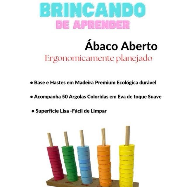 Produto Novo. Compras efetuadas até às 17h serão despachadas no mesmo dia. Todos os pedidos são enviados bem embalados, protegidos e com nota fiscal. ------------------------------------------------------------------------------------ Ábaco de Madeira com Argolas de EVA – A Ferramenta Ideal para o Desenvolvimento Infantil! Transforme a aprendizagem dos seus pequenos com o nosso encantador ábaco de madeira, projetado para estimular o desenvolvimento cognitivo e motor das crianças de forma divertida e envolvente! 🌟 Características do Produto: Construção em Madeira Premium: Durável e ecológica, a madeira proporciona um toque natural e resistente, garantindo a segurança e longevidade do brinquedo. Argolas Coloridas de EVA: As argolas são feitas de EVA, um material macio e leve, ideal para as pequenas mãos. Disponíveis em cores vibrantes, elas atraem a atenção das crianças e facilitam a identificação e o aprendizado das cores. Design Ergonomicamente Planejado: O ábaco possui uma estrutura estável e é fácil de manusear, permitindo que as crianças movam as argolas com facilidade e sem esforço, promovendo a coordenação motora fina. 🌟 Benefícios Educacionais: Desenvolvimento da Matemática: Ajuda as crianças a compreender conceitos básicos de matemática, como adição, subtração, e contagem, de forma visual e prática. Estimulação da Coordenação Motora: A movimentação das argolas ao longo das barras do ábaco promove o aprimoramento da coordenação motora e da destreza manual. Aprimoramento da Concentração: Manusear as argolas e seguir padrões estimula a atenção e o foco, contribuindo para o desenvolvimento da concentração. Estimulação Sensorial: As cores vibrantes e o toque suave das argolas de EVA oferecem uma rica experiência sensorial que engaja os sentidos e promove o aprendizado ativo. Incentivo ao Aprendizado Independente: Oferece às crianças a oportunidade de explorar conceitos matemáticos de forma autônoma e lúdica, promovendo a autoconfiança e o amor pela aprendizagem. 🌟 Segurança e Qualidade: Acabamento Seguro: Todos os materiais são seguros e livres de produtos químicos nocivos, com bordas suavizadas para garantir um uso seguro. Fácil de Limpar: A superfície da madeira é fácil de limpar, e as argolas de EVA são resistentes e simples de manter. Proporcione ao seu filho uma ferramenta de aprendizado que combina diversão, segurança e desenvolvimento! O ábaco de madeira com argolas de EVA é o brinquedo educativo perfeito para fomentar habilidades matemáticas e motoras enquanto garante horas de entretenimento. Adquira já o seu e veja seu pequeno explorador crescer e aprender com alegria! 🌟 Qualquer dúvida é só chamar no chat!