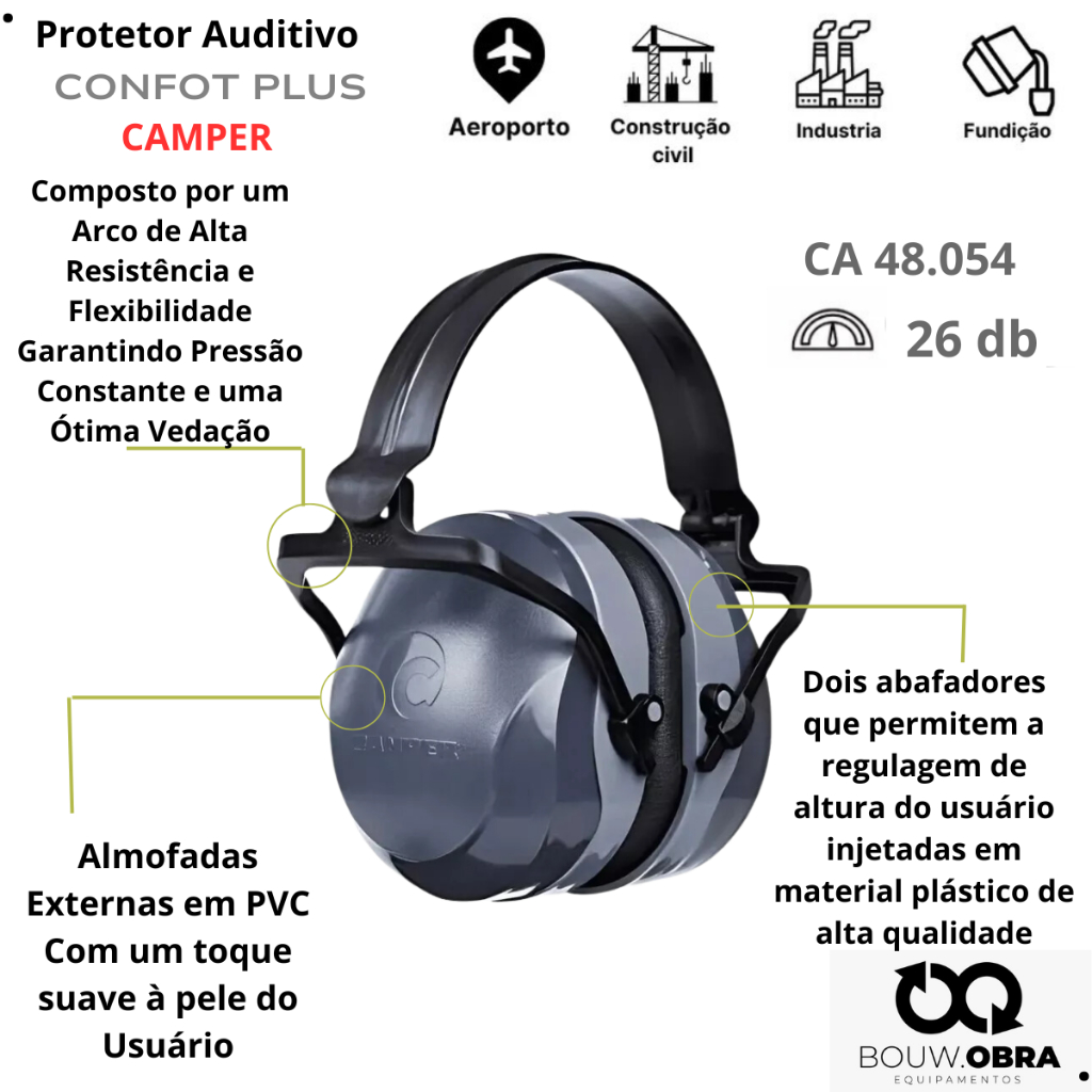 Seja Bem-vindo à Bouw Equipamentos e EPI! Apresentamos o Protetor Auditivo Confort Plus da marca CAMPER – a escolha ideal para quem busca proteção auditiva de alta qualidade. Com uma impressionante atenuação de 26 dB, este modelo se destaca em comparação aos concorrentes, que oferecem apenas 23 dB na mesma faixa de preço. Por que escolher o Protetor Auditivo Confort Plus? Melhor Custo-Benefício: Este protetor auditivo combina durabilidade, conforto e um preço acessível. Não há necessidade de comprometer a qualidade em nome da economia! Conforto e Qualidade: A haste acima da cabeça proporciona uma pressão constante, garantindo uma vedação eficaz e conforto prolongado durante longas jornadas de trabalho. Características Principais • Proteção: Atenuação de 26 dB, assegurando segurança auditiva em ambientes ruidosos. • CA: 48.054, atestando a conformidade e qualidade do produto. • Armazenamento: Pode ser estocado por até 5 anos em local seco e ventilado. • Limpeza e Cuidados: Siga as instruções para manter a eficiência e evitar desconfortos. Utilização Versátil Ideal para ambientes onde o uso de protetores auditivos tipo concha é recomendado, o Protetor Auditivo Confort Plus é compatível com outros EPIs e fácil de armazenar. Atenção ao Prazo de Validade Com uma validade de 5 anos e uma vida útil de 24 meses após a abertura, você pode confiar na durabilidade deste produto. Troque os protetores ao sinal de desgaste, garantindo sempre a melhor proteção. Promoção Especial! Adquira unidades avulsas ou kits com até 16 unidades. Para compras feitas até às 10h, enviamos no mesmo dia! Não comprometa sua saúde auditiva! Invista no Protetor Auditivo Confort Plus e experimente a combinação perfeita de qualidade, conforto e economia. Entre em contato e garanta o seu agora mesmo!