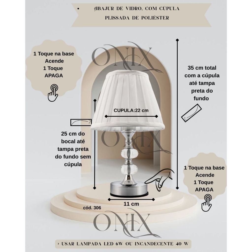 Abajur Vidro Cristal de toque Bivolt 35cm Quarto Sala 306
