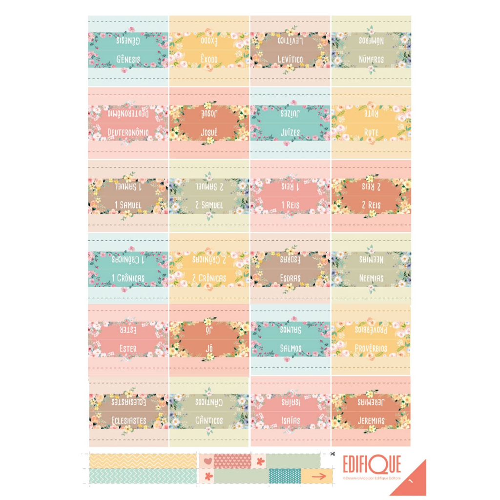 As Abas adesivas decoram sua Bíblia e facilitam ao manuseá-la, pois você encontrará com mais rapidez até os livros menores e menos utilizados. São 66 livros, de Gênesis a Apocalipse. As cartelas também contêm adesivos decorativos para recortar e usar e outros com espaço para anotar. São 3 cartelas de adesivos exclusivas que já são as queridinhas dos fãs de Bible Journaling, as famosas Bíblias com Espaço para Anotações, além de poder fazer parte de qualquer Bíblia, sendo de estudo ou não. Especificação do produto Marca: Edifique Editora Idioma: português Acabamento: adesivo Medida: 21,0 x 29,5 cm Páginas: 3 cartelas Peso: 0,070 kg SKU: 44111