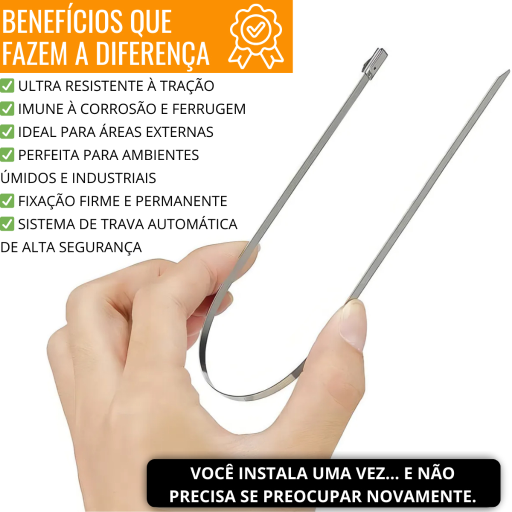 ** NOSSAS FOTOS POSSUEM REGISTRO E PROTEÇÃO DE CRIAÇÃO DE IMAGEM ** - Somos uma loja 100% online. Aqui sua compra e seu dinheiro estão 100% seguros. - EMITIMOS NOTA FISCAL E TEMOS MAIS AGILIDADE NA SUA ENTREGA. - PRODUTO JÁ NO BRASIL COM ENVIO IMEDIATO - SEM IMPOSTOS ADICIONAIS. KIT COM 100 ABRAÇADEIRAS DE AÇO INOX 4,6 x 300mm Principais características: - Qualidade Premium, aço inoxidável com máxima resistência à corrosão e durabilidade - Design exclusivo com estrutura de fivela de bloqueio automático para instalação rápida e fácil - Aplicação de ampla gama na indústria, naval, petróleo, eletricidade, computador, mecânica e muito mais - Solução ideal para fixação de projetos em condições extremas e áreas perigosas Dicas: - Os laços de cabo de travamento automático podem ser instalados à mão ou com uma ferramenta de tensão, e recomenda-se o uso de luvas para proteger as mãos. - Os laços zip não podem ser liberados uma vez dobrados. Utilize alicates para cortar os laços zip se desejar removê-los. Especificações: - Material: Aço inoxidável - Dimensões: 4.6mm x 300mm / 0.2 in - Temperatura de operação: -80°C a +540°C - Resistência à tração: 100kg