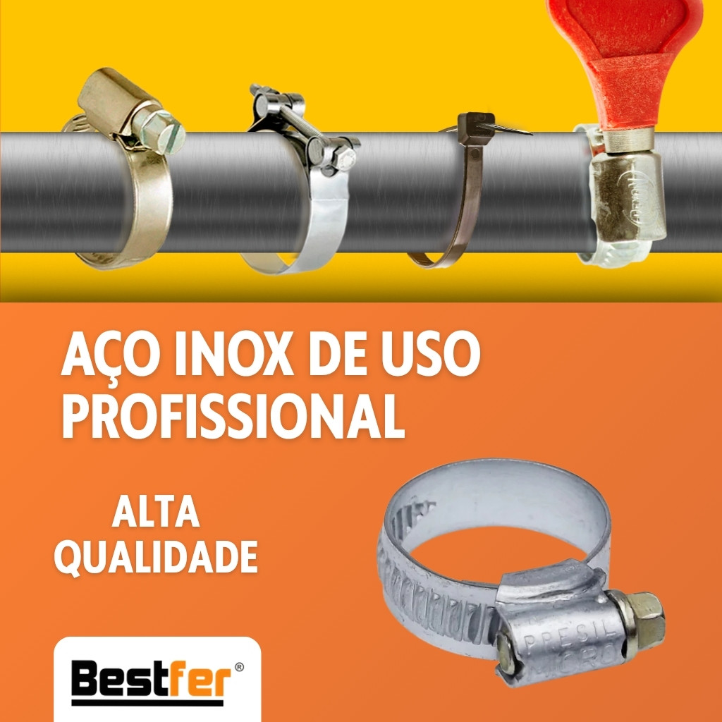 As abraçadeiras de aço com rosca sem fim são ideais para fixar objetos em tubos e mangueiras, garantindo segurança e praticidade. Com esse pacote de 50 peças da marca Bestfer, você terá abraçadeiras resistentes e duráveis para diversas aplicações. Com tamanho variando de 25 a 38 mm, essas abraçadeiras são versáteis e se adaptam a diferentes diâmetros de tubos e mangueiras. Fabricadas em aço, possuem alta resistência à corrosão e ao desgaste, garantindo a qualidade do produto. Com essa solução de fixação, você terá maior segurança e praticidade em suas aplicações. Adquira já as suas abraçadeiras de aço com rosca sem fim da Bestfer e tenha a qualidade e eficiência que você precisa. Material do Produto: Aço Inox e Ferro | Espessura: 8mm ABRAÇADEIRAS Utilizada em mangueiras para gás, água e outros.