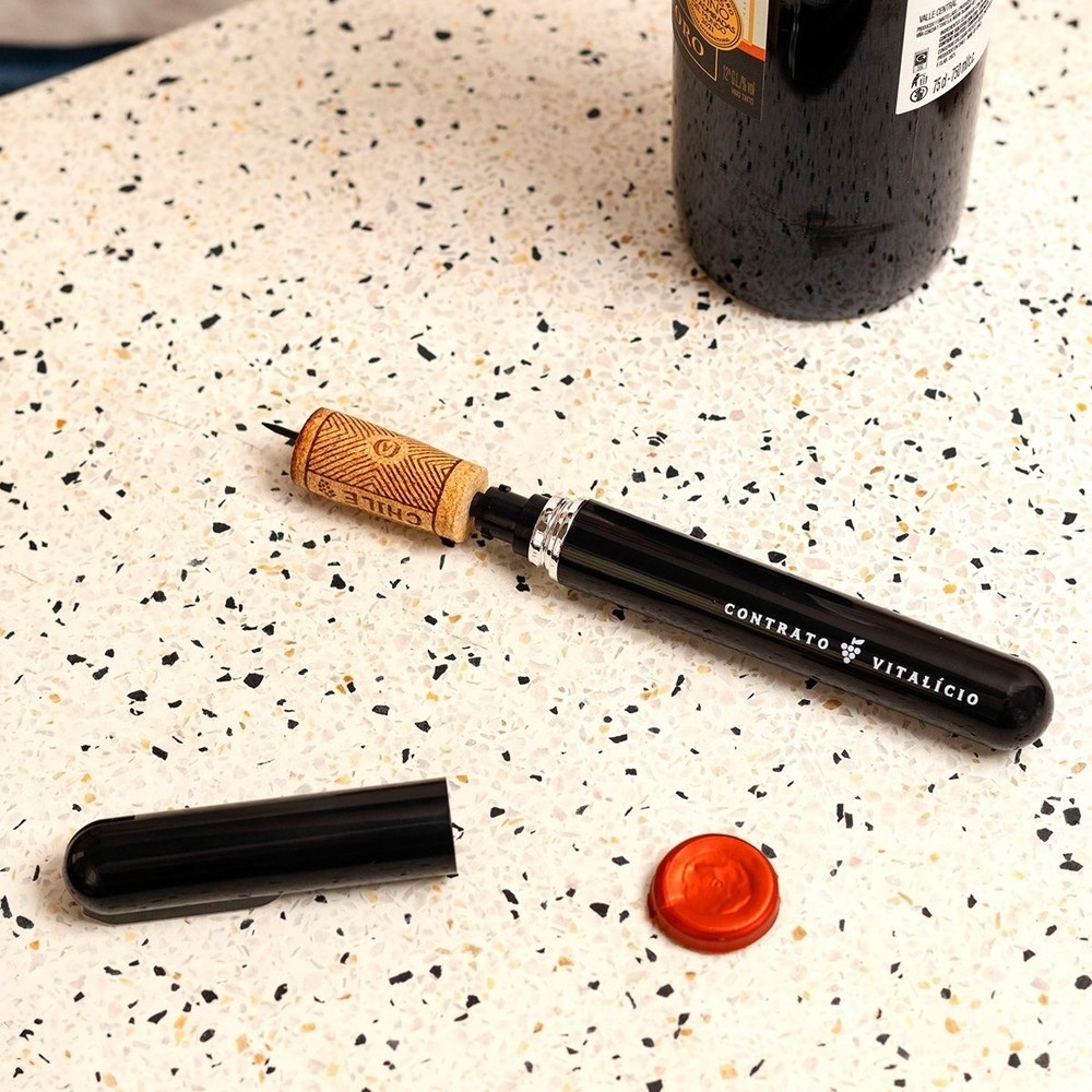 Já pensou em abrir seus vinhos com a mesma elegância com que assina um documento importante? Pois com o nosso Abridor de Vinho Contrato Vitalício, você vai poder contar com sofisticação e criatividade de sobra para surpreender a todos durante um almoço em família, um jantar com os amigos ou simplesmente durante aquele seu momento "sommelier de sofá". Contando com um design clean e moderno, esse abridor pneumático vem em uma caixa super presenteável e conta com um formato que imita uma caneta. E aí, pronto pra brindar o seu novo contrato? Contém 1 abridor de vinho pneumático e 1 manual de instruções. Não podem ser vendidos separadamente. Dimensões: Case: 23 cm x 7 cm x 3,8 cm. Abridor: 20,25 cm x 2,1 (diâmetro). Material: Cloreto de polivinila, zinco, copolímero de etileno acetato de vinil, 100% poliéster. Abridor: ABS, ferro inoxidável 420, SS304. Limpar somente com pano seco. Teme químicos e abrasivos. Validade indeterminada.