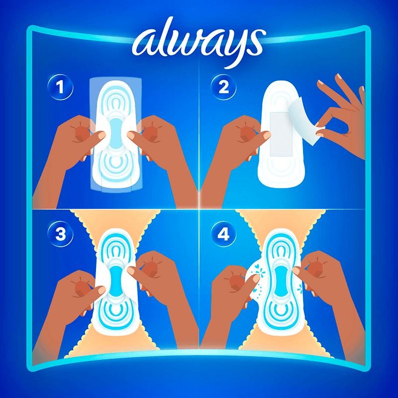 O Absorvente Always Seca possui formato anatômico que se adapta ao corpo, com barreiras anti-vazamentos. Formato adaptável a sua calcinha, Cobertura de malha seca que absorve instantaneamente.