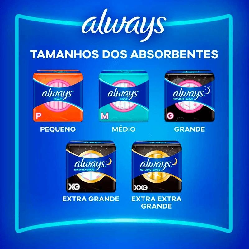 O Absorvente Always Suave conta com uma cobertura delicada, confortável e com uma tecnologia especial de absorção instantânea e duradoura.