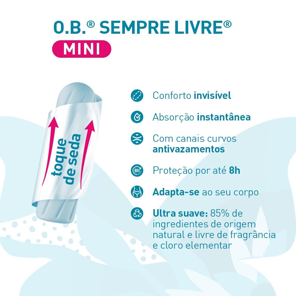 "O.B.® SEMPRE LIVRE™ é um absorvente interno desenvolvido por uma ginecologista para proporcionar proteção e conforto para a mulher durante o período menstrual. O núcleo absorvente de O.B.® SEMPRE LIVRE™ é feito de fibras absorventes derivadas de polpa de celulose, eles são revestidos por um material que é um filme perfurado (que facilita a colocação e remoção do absorvente interno). Além disso, conta com um cordão, preso ao produto, que é testado em toda a produção, e ajuda a segurar o produto no momento da inserção e da retirada. O produto não apresenta superabsorvente (polímero acrílico) ou adesivo em sua composição. O absorvente interno O.B.® SEMPRE LIVRE™ super tem 8 canais curvos que guiam o fluxo menstrual para o núcleo do absorvente interno e ajudam a evitar vazamentos."