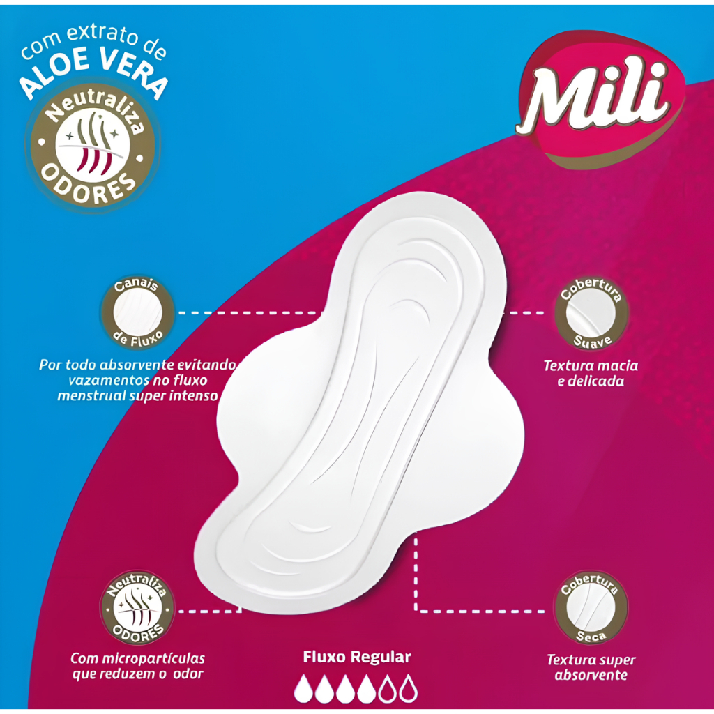 Absorvente Mili Proteção Total c/ Abas 16 unidades – formato alongado e cobertura macia que se adapta ao corpo, canais anti‑vazamento e micropartículas neutralizadoras de odor. Hipoalergênico, dermatologicamente testado. Fluxo médio a intenso.