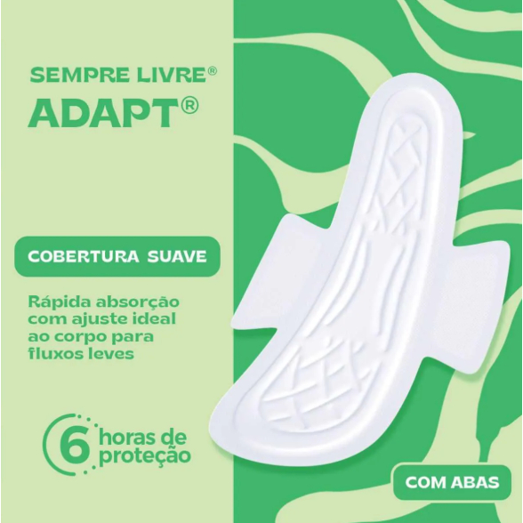 O Absorvente Sempre Livre Adapt com cobertura suave e abas oferece conforto, proteção e ajuste ao corpo. Ideal para o dia a dia, possui rápida absorção e barreiras que evitam vazamentos. Embalagem com 16 unidades, perfeita para manter você segura e tranquila.