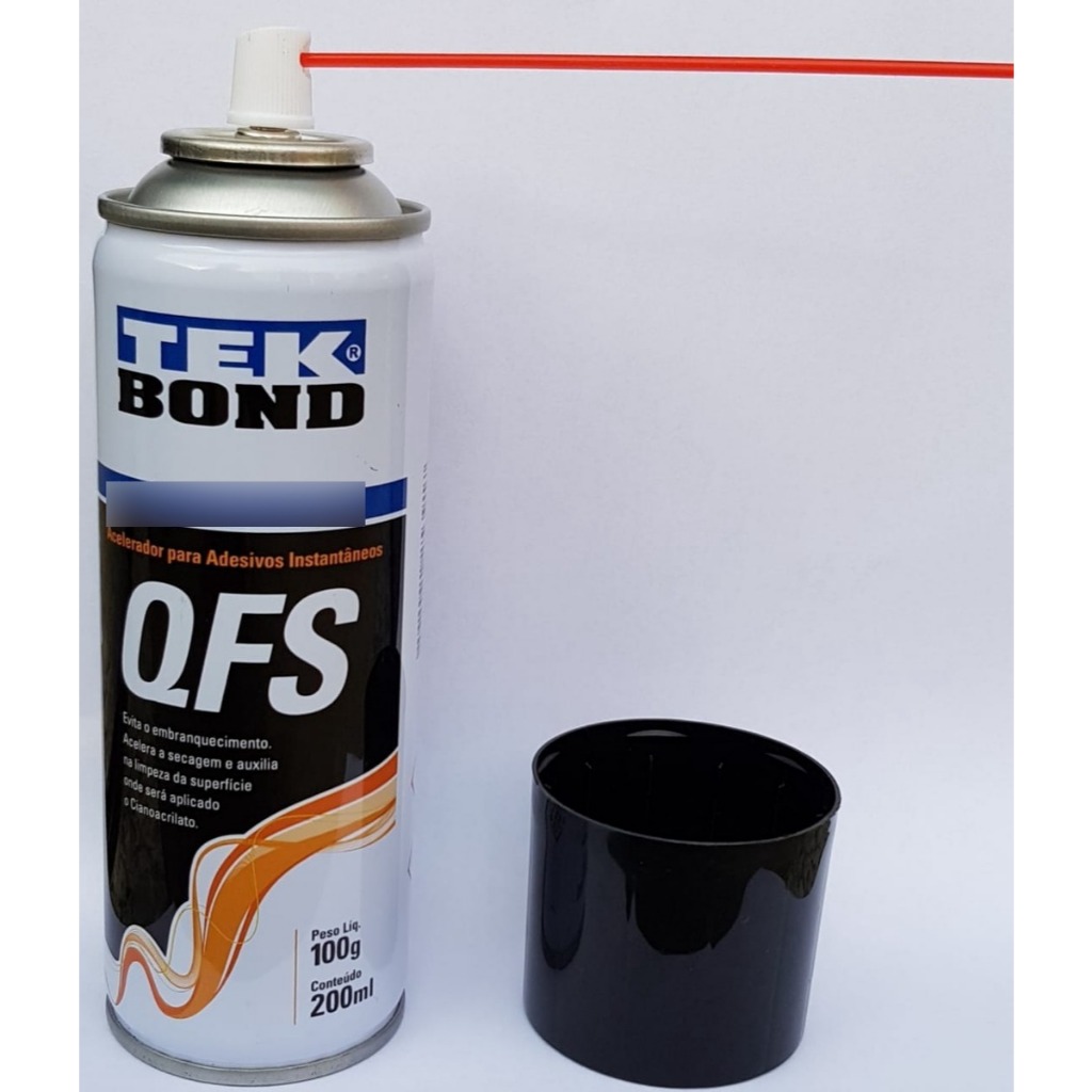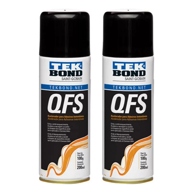 KIT 2 ACELERADOR ATIVADOR DE COLA INSTANTÂNEA CIANOCRILATO QFS TEKBOND 200ML O ACELERADOR QFS é um produto monocomponente à base de solvente, destinado a acelerar a cura de adesivos à base de cianoacrilato. Evita o embranquecimento das peças a serem coladas. ESPECIFICAÇÕES TÉCNICAS: - tipo: acelerador ativador de cola instantânea cianocrilato QFS - Cor: Incolor - Estado Físico: Líquido - Odor: Característico - Solubilidade: Insolúvel em água - Densidade (g/cm³): 0,78 a 0,82 - Tempo de secagem: 20 segundos APLICAÇÕES: - Recomenda-se para superfícies de materiais passivos de cura lenta, locais de grandes folgas e ambientes onde a temperatura é inferior a 15ºC. Pode ser utilizado também para melhorar o acabamento, pois evita o embranquecimento das peças. CARACTERÍSTICAS: - É um produto monocomponente, à base de solvente, destinado a acelerar a cura de adesivos à base de cianoacrilato. Evita o embranquecimento das peças a serem coladas.