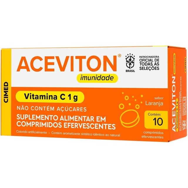 Aceviton Imunidade Vitamina C 1g com 10 Comprimidos Efervescentes é um suplemento formulado para fortalecer o sistema imunológico e contribuir para mais disposição no dia a dia. Sua apresentação efervescente garante melhor dissolução, sabor agradável e praticidade no consumo diário. ``` Principais Características: • Contém 1g de vitamina C por comprimido • Fórmula efervescente de rápida diluição • Sabor cítrico de fácil aceitação Benefícios: • Auxilia no fortalecimento do sistema imunológico • Contribui para o aumento da energia e redução do cansaço • Ajuda na proteção antioxidante do organismo • Ideal para uso diário como reforço nutricional Diferenciais do Produto: • Alta concentração de vitamina C em dose única • Comprimido efervescente que facilita o consumo • Prático para incluir na rotina, podendo ser consumido em qualquer lugar Especificações Técnicas: • Peso: 45 g Instruções de Uso: • Dissolver 1 comprimido em um copo com água e consumir após a dissolução completa • Utilizar conforme orientação de um profissional de saúde, se necessário Avisos e Precauções: • Não exceder a dose diária recomendada • Manter fora do alcance de crianças • Armazenar em local fresco, seco e protegido da luz • Consulte um profissional antes do uso caso tenha condições de saúde específicas O que está incluso? • 1 tubo com 10 comprimidos efervescentes Aceviton Imunidade Vitamina C 1g ``` ---- DÚVIDAS FREQUENTES ---- Os produtos são originais? Sim. Todos os nossos produtos são originais. Emitem nota fiscal? Sim. Emitimos nota fiscal para todos os pedidos.