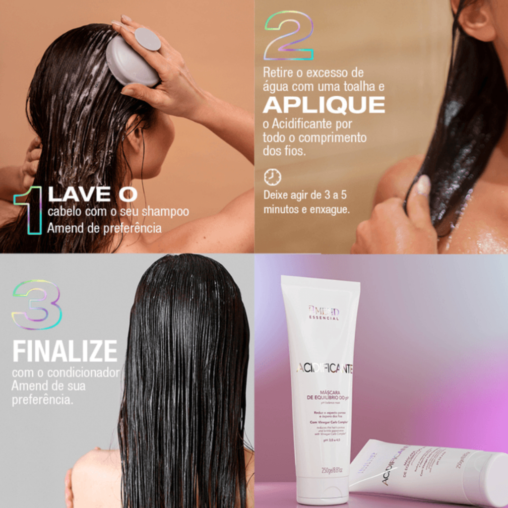 Amend Acidificante Equilibrante pH 250ml O Amend Acidificante é um tratamento capilar desenvolvido para reequilibrar o pH dos fios, selar as cutículas e restaurar a saúde capilar após processos químicos como coloração, descoloração, alisamentos ou uso excessivo de calor. Sua principal função é acidificar os fios, que geralmente ficam alcalinos após esses procedimentos, causando porosidade, frizz, opacidade e quebra. Com pH ácido, o produto devolve o equilíbrio natural, promovendo cabelos mais alinhados, brilhosos, macios e resistentes. Benefícios - Reequilibra o pH dos fios - Sela cutículas abertas por químicas - Reduz frizz e porosidade - Aumenta o brilho e a maciez - Potencializa tratamentos posteriores Indicação Para todos os tipos de cabelo, especialmente os quimicamente tratados, porosos, elásticos ou danificados. Modo de uso Após lavar os cabelos com shampoo, aplique o produto mecha por mecha, massageando suavemente. Deixe agir por 5 a 10 minutos e enxágue bem. Prossiga com a máscara ou tratamento de sua preferência.