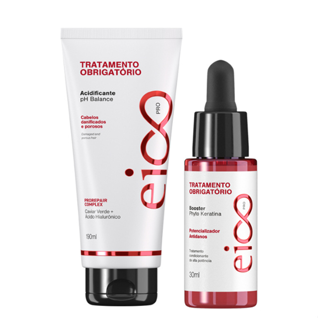 1- Acidificante Reconstrutor Tratamento Obrigatório Eico Professional 200ml 1- Booster Phyto Keratina Tratamento Obrigatório 30ml Sem Sal, Sem Parabenos, Sem Petrolatos, Sem Corante - Linha Liberada A linha Tratamento Obrigatório Eico Professional foi desenvolvida para aqueles cabelos quimicamente tratados, danificados, quebradiços, rebeldes e porosos. Reconstrução perfeita para quem procura a recuperação da fibra capilar. Ativos: Caviar Verde e Ácido Hialurônico Acidificante Reconstrutor Tratamento Obrigatório Eico Professional 200ml : O Selante Acidificante Reconstrutor Tratamento Obrigatório Eico Professional proporciona efeito fortificante e restaurador de danos, ele trata a fibra capilar de dentro pra fora, elimina os fios quebradiços e estabiliza o PH do cabelo. Possui fórmula enriquecida com ativos reconstrutores que agem diretamente na regeneração da fibra capilar. Além de promover a finalização perfeita deixa seu cabelo super perfumado!Modo de usar:Sobre os fios limpos, secos ou úmidos, aplique o produto por todo o comprimento e pontas, mas evite a raiz. Deixe agir de 10 a 15 minutos depois enxágue todo o produto. Potencializador: Potencializador de Alta Reconstrução - Reconstrutor PhytoKeratina. Pode ser usado na hora da aplicalção junto com a Máscara De Tratamento Obrigatório Eico Professional ou na finalização após lavar os cabelos para pentear. Modo de usar:Sobre os fios limpos, secos ou úmidos, aplique por todo o comprimento e pontas do cabelo, mas evite a raiz. Penteie o cabelo, modele e finalize como preferir.Resultado Ação Fortalecedora, Evita Quebra, Fios protegidos, selados e fortificados.