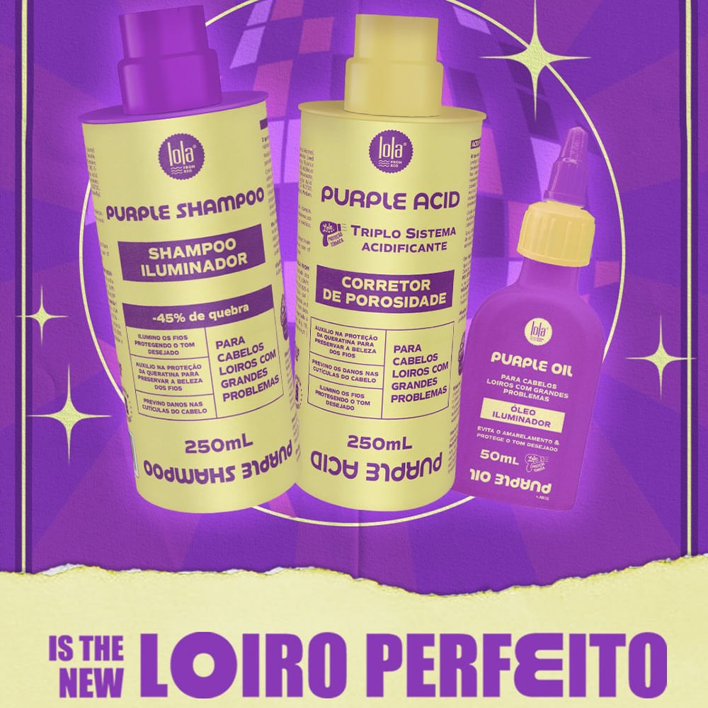 O Purple Acid Lola Cosmetics é um corretor de porosidade desenvolvido especialmente para quem possui cabelos loiros, descoloridos, coloridos ou extremamente danificados. Com seu Triplo Sistema Acidificante, ele atua na fibra capilar, selando as cutículas, reequilibrando o pH e reparando profundamente os fios. Sua fórmula inteligente previne a perda proteica causada por processos químicos, como descoloração e coloração, além de evitar o amarelamento dos fios, deixando o tom platinado ou loiro muito mais intenso, luminoso e saudável. Benefícios:• Corrige a porosidade dos fios• Sela as cutículas e reequilibra o pH capilar• Previne a perda de proteínas e nutrientes• Evita o amarelamento dos cabelos loiros• Auxilia na proteção contra danos químicos e térmicos• Fios mais alinhados, nutridos e com menos frizz• Proporciona brilho intenso, maciez e aparência rejuvenescida Ativos Principais:• Complexo inteligente de proteção capilar: Atua na fibra prevenindo danos e protegendo contra a perda proteica• Fórmula com tripla ação acidificante, que equilibra, sela e repara profundamente os fios Modo de Uso:• Após lavar os cabelos com shampoo, retire o excesso de água com uma toalha.• Aplique o Purple Acid do comprimento às pontas, evitando a raiz.• Deixe agir por 5 a 10 minutos, dependendo do grau de porosidade dos fios.• Enxágue bem e, se desejar, finalize com a máscara de sua preferência.• Utilize semanalmente, principalmente se os cabelos estiverem muito danificados. Sobre a Marca: A Lola Cosmectis surgiu a partir de uma escolha: ser feliz! Levar a vida com bom humor, ainda que nada pareça dar certo. Nem mesmo o seu cabelo! A paixão da Lola são seus cabelos e o objetivo é oferecer linhas de tratamento capilar ideais para cada tipo de cabelo. Com seus produtos para cabelos especiais, a missão da Lola e dos seus cosméticos é uma só: permitir que você use sua cabeleira sem culpa, como deseja, com bom humor e ousadia. • Cabelos loiros com grandes problemas? O Purple Acid da Lola é seu melhor aliado para fios mais saudáveis, brilhantes e sem porosidade!