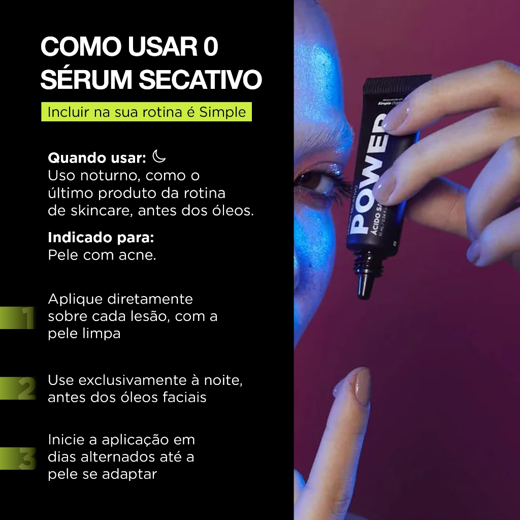 O primeiro Ácido Salicílico Natural e certificado do Brasil, na versão prática e eficaz. O Ácido Salicílico Natural Sérum Secativo foi desenvolvido para aplicação direta e pontual nas espinhas inflamadas. Ele suaviza a acne, previne as marcas deixadas pelas lesões e limpa profundamente os poros. Sua fórmula conta com os dois ácidos que são referência na dermatologia natural para as peles acneicas: o Ácido Salicílico e o Ácido Chiquímico. Juntos, os ativos regeneram a pele e oferecem alto poder secativo. É a escolha de uso pontual e exclusivamente noturno para peles oleosas e acneicas. Deve ser aplicado diretamente sobre as espinhas, como o último produto da rotina de skincare, antes dos Óleos. Sua fórmula é natural, vegana e livre de ingredientes sintéticos e problemáticos, como Triethanolamine, Propylene Glycol, Phenoxyethanol, EDTA, PEGs e Silicones. Possui embalagem sustentável, derivada da cana de açúcar e com selo i'm green.