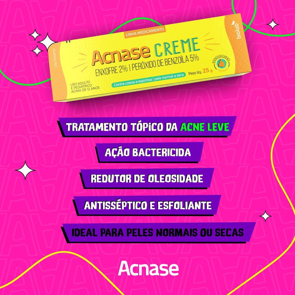 ACNASE CREME Contra cravos e espinhas. Esfoliante, antisséptico e bactericida. Indicação: Tratamento tópico da acne. Modo de Ação: Acnase Creme tem ação germicida, reduz o excesso de gordura e é indic