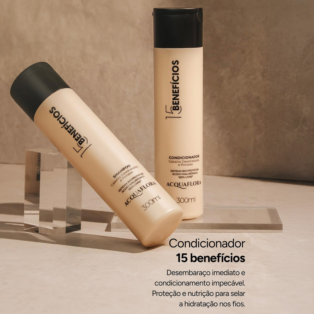 Acquaflora 15 Beneficios Condicionador 300ml Ideal para cabelos desidratados, porosos e que necessitam de proteção. Livre de sal, sulfatos, parabenos, óleo mineral e liberado para low poo, desembaraça instantaneamente promovendo condicionamento, reposição eficiente e duradoura da hidratação e benefícios multifuncionais. Modo de Uso: Após lavar os cabelos com o Shampoo Acquaflora 15 Benefícios, retirar o excesso de água e aplicar o Condicionador Acquaflora 15 Benefícios por todo o comprimento dos fios. Massagear por alguns minutos e enxaguar em seguida. Para um melhor resultado finalize com o Leave-In Acquaflora 15 Benefícios.