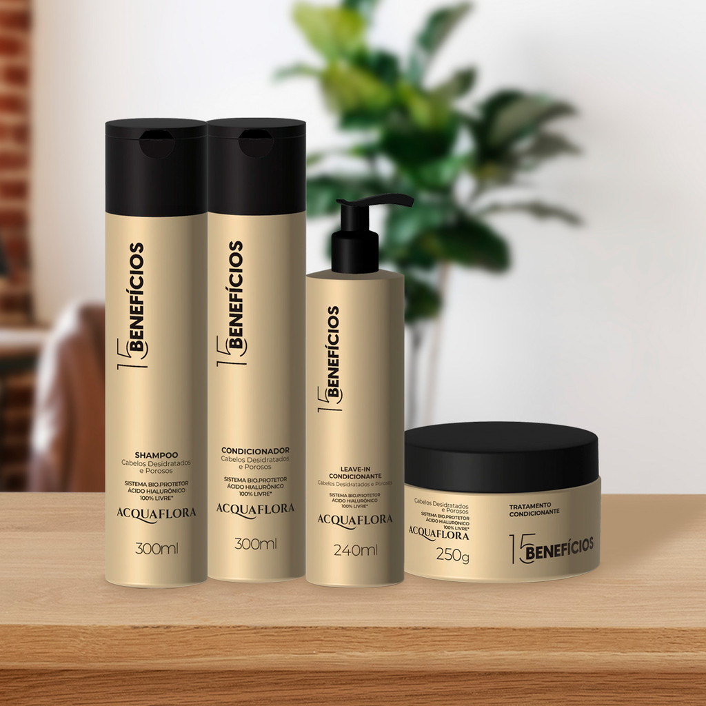 Acquaflora 15 Beneficios Leave in 300ml Ideal para cabelos desidratados, porosos e que necessitam de proteção, foi desenvolvido para proteger os cabelos durante a secagem, melhorar a penteabilidade, modelar, auxiliar no controle de volume, além de hidratar e fornecer brilho. Com proteção solar e térmica: protege os fios dos raios solares e do calor do secador, chapinha e demais ferramentas de calor. Livre de sal, sulfatos, parabenos e óleo mineral. Modo de Uso: Após lavar e hidratar os cabelos com os produtos da linha Acquaflora 15 Benefícios, remover o excesso de umidade com uma toalha, aplicar uma pequena quantidade do Leave-In nos fios e finalizar como desejar.