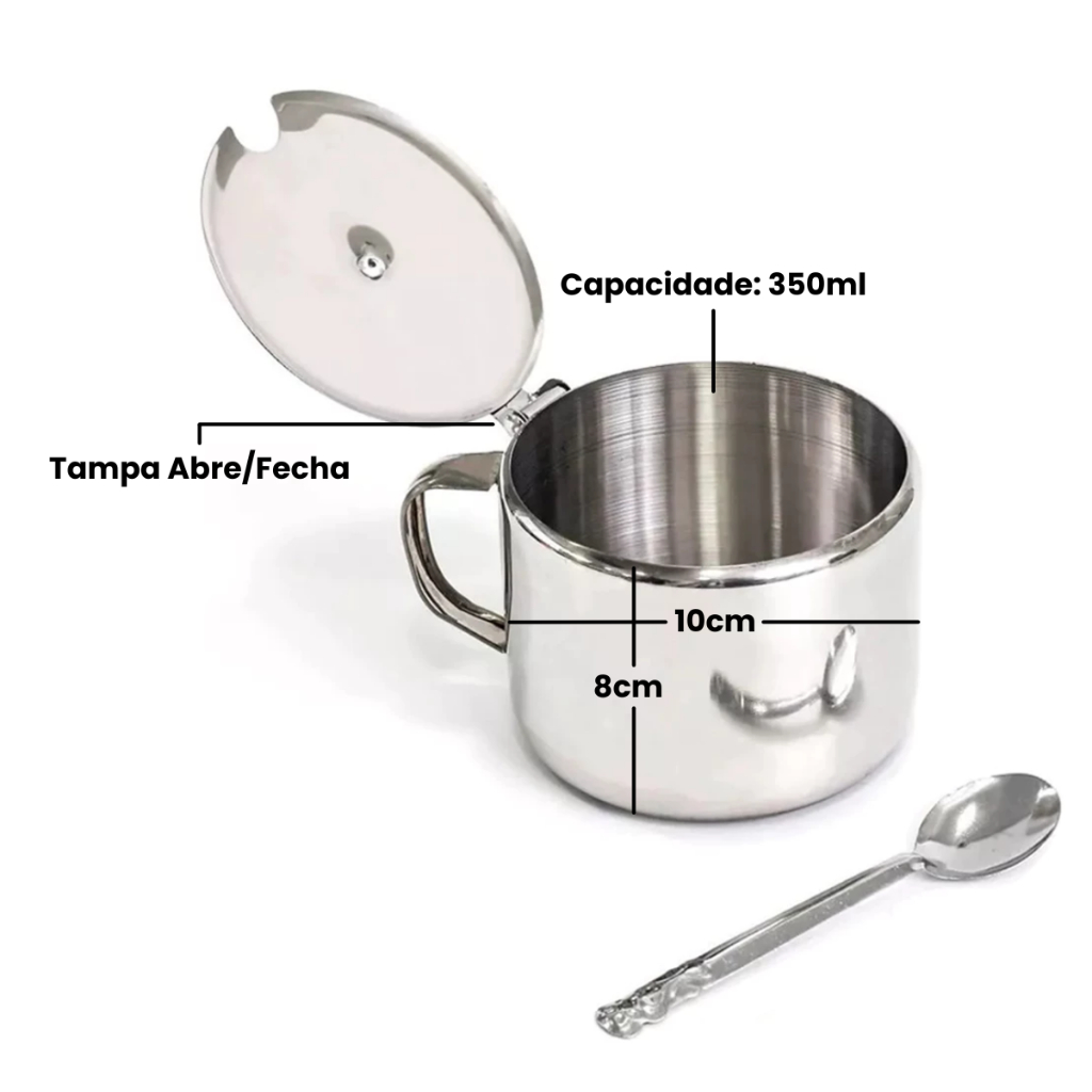 Açucareiro 350ml Em Aço Inox Com Colher Cafeteria Restaurantes