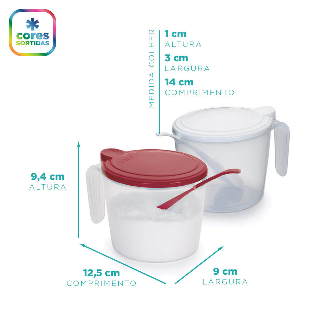 _______________________________________DESCRITIVO AÇUCAREIRO:Peso: 50 gLargura: 9 cmComprimento: 12,5 cmAltura: 9,4 cmDESCRITIVO COLHER:Largura: 3 cmComprimento: 14 cmAltura: 1 cm_______________________________________DIFERENCIAIS:BPA Free (Livre de BPA - O BPA é uma substância química que faz mal à saúde)Design alegre que se adequa em todos os momentosMaterial incrivelmente resistente_______________________________________