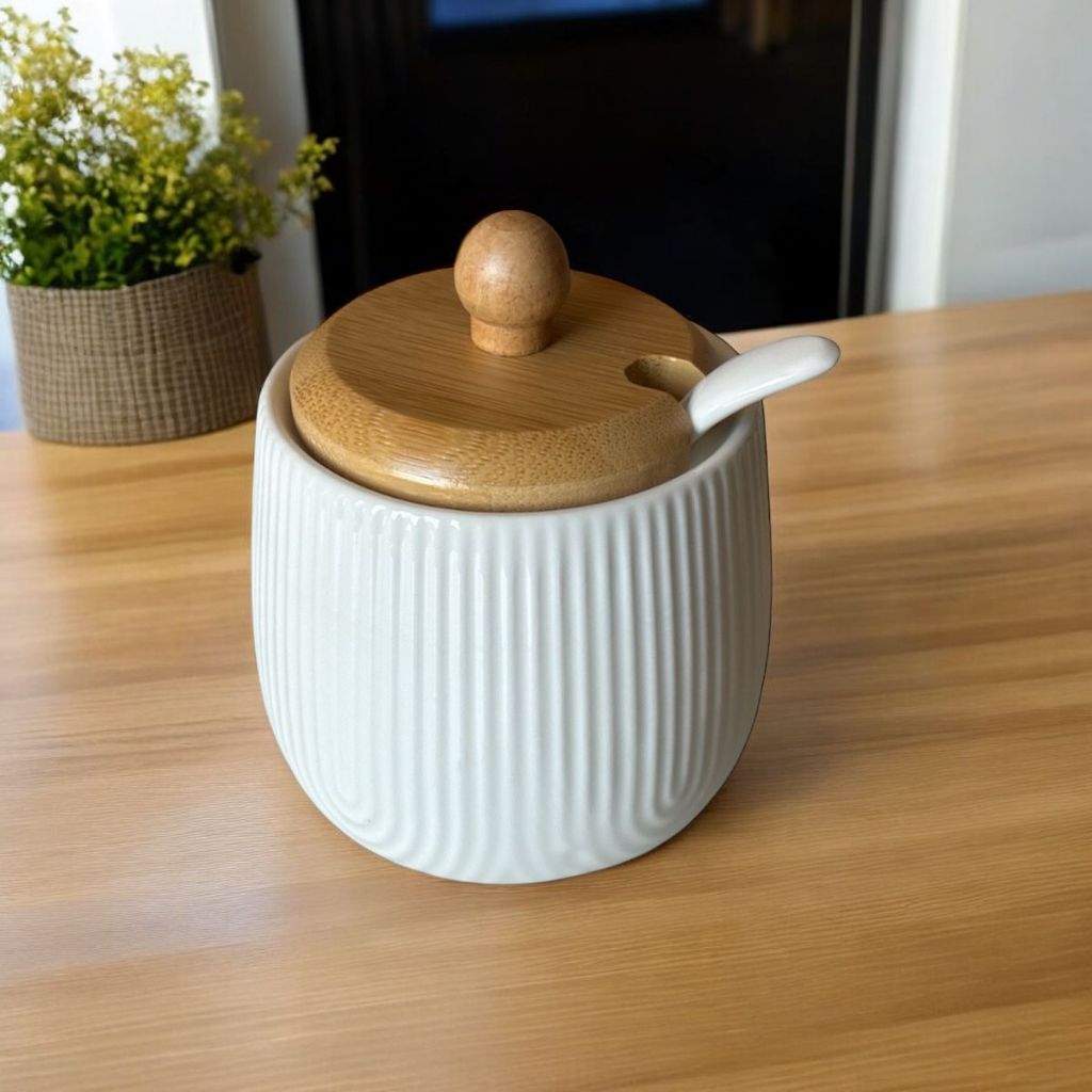 AÇUCAREIRO COM TAMPA EM BAMBU E COLHER EM CERÂMICA Adicione um toque de charme e funcionalidade à sua mesa com este elegante açucareiro de cerâmica. Seu design refinado combina a beleza clássica da cerâmica com a rusticidade sofisticada da tampa de bambu. A cerâmica de alta qualidade garante durabilidade e um acabamento suave, enquanto a tampa de bambu mantém o açúcar fresco e livre de umidade. Acompanha uma colher prática, também em cerâmica, para uma utilização fácil e conveniente. Ideal para qualquer ambiente, desde a cozinha moderna até a mesa de café mais aconchegante, este açucareiro é a escolha perfeita para quem valoriza tanto o estilo quanto a praticidade. ESPECIFICAÇÕES: Material: Cerâmica e Bambu Medidas açucareiro: 9 x 9 x 11,5cm Medidas colher: 11 x 2 x 2cm