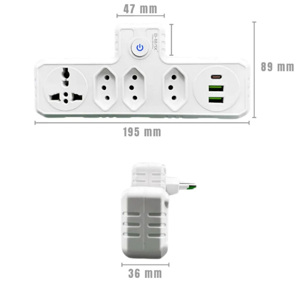 Adaptador Bivolt BM-8704A B-Max com 3 Tomadas Tripolar 1 Tomada Universal 2 USB 1 USB-C Carregador Rápido Multiplug