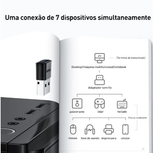 Adaptador Bluetooth Baseus BA04 Use convenientemente seus dispositivos sem fio. O adaptador Baseus BA04 suporta conexão Bluetooth 5.1 rápida e estável e seu alcance é de até 20m. Distingue-se pela ampla compatibilidade - permite conectar alto-falantes, teclados, gamepads e muitos outros dispositivos. No total, com ele você pode emparelhar até 7 dispositivos ao mesmo tempo! Conexão sem fio confiável Adeus problemas de conexão. O adaptador suporta Bluetooth 5.1, então ele pode fornecer transmissão sem fio rápida e estável. Gagueira e atrasos são coisas do passado! O dispositivo também é compatível com versões anteriores de Bluetooth 4.0, 4.1, 4.2 e 5.0. Ele também possui um sinal aprimorado - com um alcance de até 20 m, você pode desfrutar de uma conexão confiável em quase qualquer lugar da casa. Muitas possibilidades O adaptador é compatível com uma ampla variedade de dispositivos - você o achará útil esteja no trabalho ou jogando. Ele permite emparelhar um mouse ou teclado sem fio, controlador de jogo, alto-falantes e fones de ouvido com seu computador. Ou use-o para transferir arquivos entre seu smartphone e laptop via Bluetooth. Nota: Os iPhones permitem a transferência de áudio usando o adaptador, mas não permitem a transferência de dados. Suporta até 7 dispositivos simultaneamente Melhore seu fluxo de trabalho. O adaptador permite emparelhar seu computador com até 7 dispositivos simultaneamente, como alto-falante, pad, teclado, mouse, fones de ouvido, impressora e smartphone. Então você só precisa dedicar uma porta USB para conectar vários dispositivos! Além do mais, o produto lembra os dispositivos configurados uma vez para emparelhá-los automaticamente mais tarde, economizando seu tempo. Plug & Play Usando um laptop ou computador com Windows 8.1, 10 ou 11? Temos boas notícias para você! Você não precisa perder tempo instalando drivers e configurando adaptadores complicados. Com o sistema plug & play, tudo o que você precisa fazer é conectá-lo ao computador. Além disso, o indicador integrado que acende em azul fornecerá informações sobre o status do dispositivo.
