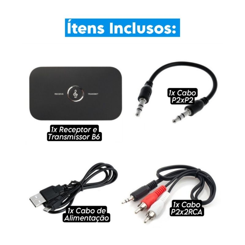 🚚 ENVIO EM 24 HORAS: O produto se encontra no Brasil, pronto para a entrega SOBRE: Apresentamos nosso mais recente lançamento: o Receptor e Transmissor de Áudio Bluetooth B6. Adapte seus aparelhos, experienciando um som de extrema qualidade. SEGURE O BOTÃO PRINCIPAL PARA LIGAR E DESLIGAR MODO "TRANSMIT": No modo transmissor, o aparelho capta áudio através de cabos auxiliares conectados a dispositivos como TVs, players de DVD e sistemas de som, e o transmite via Bluetooth para fones de ouvido ou caixas de som, por exemplo. MODO "RECEIVE": Este modo permite receber áudio via Bluetooth de dispositivos como smartphones e tablets, e transmiti-lo para equipamentos sem função sem fio, como sistemas de som mais antigos, através dos cabos auxiliares inclusos. AMPLA COMPATIBILIDADE: Equipado com entradas para cabos P2 e RCA, este aparelho é compatível com uma vasta gama de dispositivos, incluindo TVs, sistemas de som, players de DVD, computadores, smartphones, tablets, notebooks, fones de ouvido, MP3 players e muito mais! PRATICIDADE: Alternar entre os modos receptor e transmissor é extremamente simples, bastando conectar o cabo em uma das entradas, que a luz vermelha indicadora irá acender, indicando que já está funcionando. Além disso, sua instalação é rápida e o dispositivo é portátil. PORTÁTIL: Com apenas 97mm de altura, 58mm de largura e 12mm de altura, o B6 é ideal para quem precisa de um dispositivo compacto e fácil de transportar. Leve-o para qualquer lugar sem esforço! ESPECIFICAÇÕES: – Versão bluetooth: 5.0 – Distância de transmissão: 10m – Tipo de bateria: Li-polímero (300mAh) – Tempo de funcionamento: 8 horas – Carregamento: Micro USB 5V – Portas de áudio: 3.5mm – Cor: Preto – Tamanho: 97mm x 58mm x 12mm – Modelo: B6 ITENS INCLUSOS: 1x Receptor e Transmissor B6 1x Cabo P2x2RCA 1x Cabo P2xP2 1x Manual do Usuário