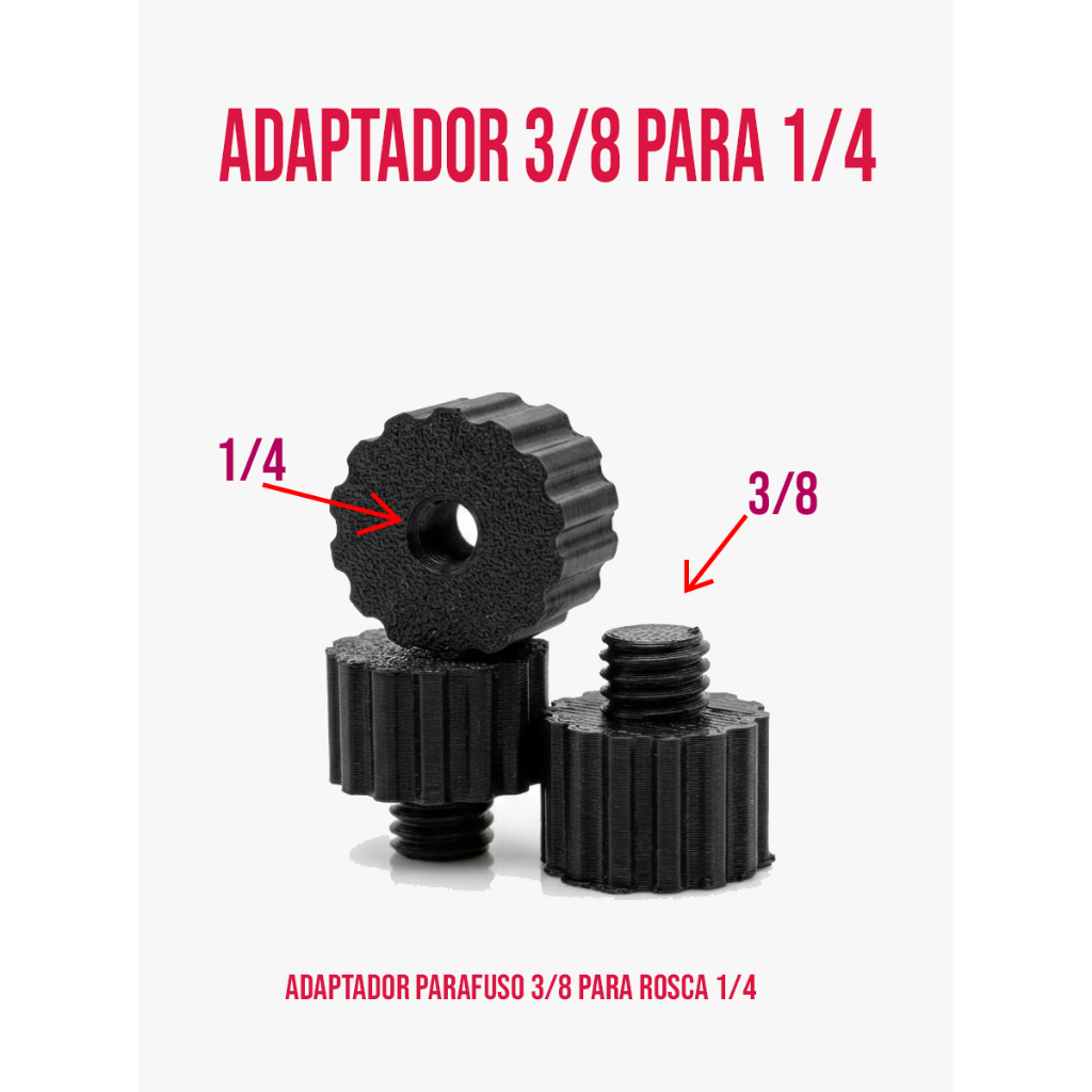 Bem Vindos :) Nós da Smart Quality trazemos produtos de alta qualidade e testado por nós, para proporcionar a melhor experiência possível aos nossos clientes. Adaptador Conversor Parafuso Dslr Rosca 3/8 Femea 1/4 Macho ========================================================================== ***ATENÇÃO*** ENVIO IMEDIATO TEMOS UM DOS ENVIOS MAIS RÁPIDOS :) NÃO ACOMPANHA ACESSÓRIOS É APENAS O ADAPTADOR DE ROSCA FÊMEA 3/8 PARA 1/4 MACHO . ========================================================================== Adaptador de rosca universal de 1/4 para 3/8 Características: Adaptador Feito em 3D ABS de alta qualidade (mesmo material utilizado em carros) Leve e resistente. Adaptador de rosca - Universal para Câmeras, Celulares, Webcams, Ring light, Etc... ========================================================================== COMPATÍVEL COM: Microfones Webcams Smartphone Câmeras fotográficas Ring Light Holofote de led etc ========================================================================== ITENS INCLUSOS: Kit 2 Adaptadores de Rosca de microfone 1/4 para 3/8 Adaptador para câmera dslr ========================================================================== Tire todas as duvidas, Estamos a disposição :) ========================================================================== Não acompanha Ring Light, Webcam e Microfone é os adaptadores.