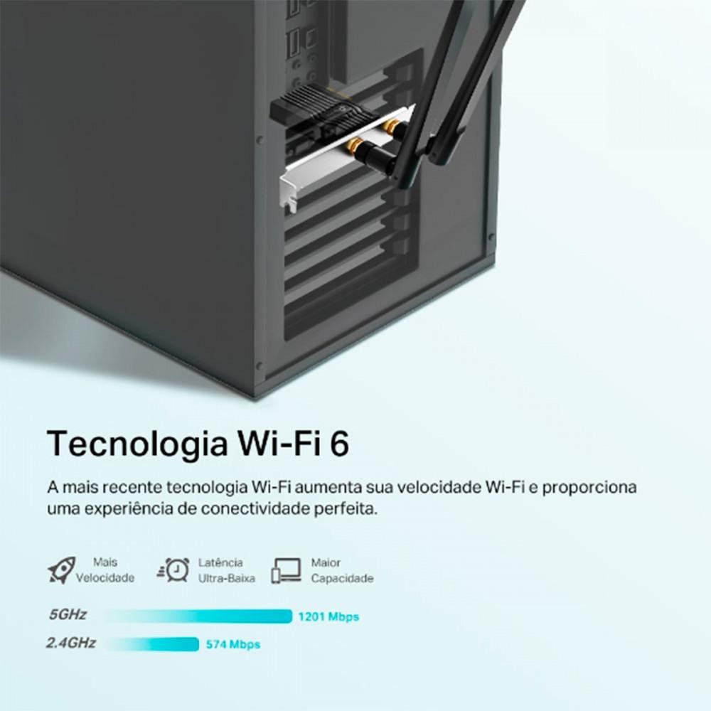 Adaptador PCIe Wi-Fi 6 Bluetooth 5.2 AX1800 - Archer TX20E O Wi-Fi 6 Transforma Tudo A mais recente tecnologia Wi-Fi 6 proporciona uma velocidade de conectividade incrível, carregamentos rápidos e ampla cobertura. Aproveite o máximo do seu plano de internet com o Wi-Fi 6. Mais Dispositivos, Mais Velocidade A tecnologia OFDMA divide os canais entre os dispositivos na rede, enquanto o MU-MIMO permite que vários clientes recebam dados simultaneamente. A combinação dessas tecnologias proporciona ao seu PC tenha conectividade Wi-Fi forte, eficiente e sem lag mesmo dentro de uma rede Wi-Fi com vários dispositivos. Compatível com Bluetooth 5.2 A mais recente Tecnologia Bluetooth 5.2 alcança velocidades 2 vezes mais rápidas e uma cobertura 4 vezes mais ampla do que o Bluetooth 4.2, para sincronizar perfeitamente com seus controles, fones de ouvido, teclados e outros dispositivos Bluetooth. Segurança de Última Geração O WPA3, o mais recente padrão de criptografia de rede, oferece maior segurança para senhas, protegendo seus dados pessoais contra hackers e mantem a sua conexão Wi-Fi segura ao acessar sites de bancos e fazer compras online. Especificações: Marca: TP-Link Modelo: Archer TX20E Cor: Preto Interface PCIe Antena Duas antenas Dual Band Padrões Wireless IEEE 802.11ax/ac/n/a 5 GHz IEEE 802.11ax/n/g/b 2.4 GHz Bluetooth 5.2 Taxa de Sinal 11n: Até 300 Mbps (dinâmico) 11g: Até 54 Mbps (dinâmico) 11b: Até 11 Mbps (dinâmico) Segurança Wireless Suporte WEP de 64/128 bits, WPA/WAP2/WPA3, WPA-PSK/WPA2-PSK, 802.1x Tecnologia de Modulação DBPSK, DQPSK, CCK, OFDM, 16-QAM, 64-QAM, 256-QAM, 1024QAM Requerimentos do Sistema Somente Windows 11/10 (64 bits) Dimensões do produto (A x L x P) 7,8 x 12 x 2 cm ANATEL: 203872303177 Certificação CE, FCC, RoHS Conteúdo do Pacote Archer TX20E Duas antenas Dual Band de alto ganho Suporte de baixo perfil Cabo de cabeçalho Bluetooth Guia de instalação rápida CD de Instalação Imagens de caráter ilustrativo. Informações divulgadas de acordo com o manual do fabricante. Em caso de dúvidas sobre informações técnicas, utilização, limitações e manuseio do produto, verifique o manual do fabricante. Produto novo na caixa, lacrado com NF e garantia do fabricante de 12 meses NAC016610 EAN:4897098688809