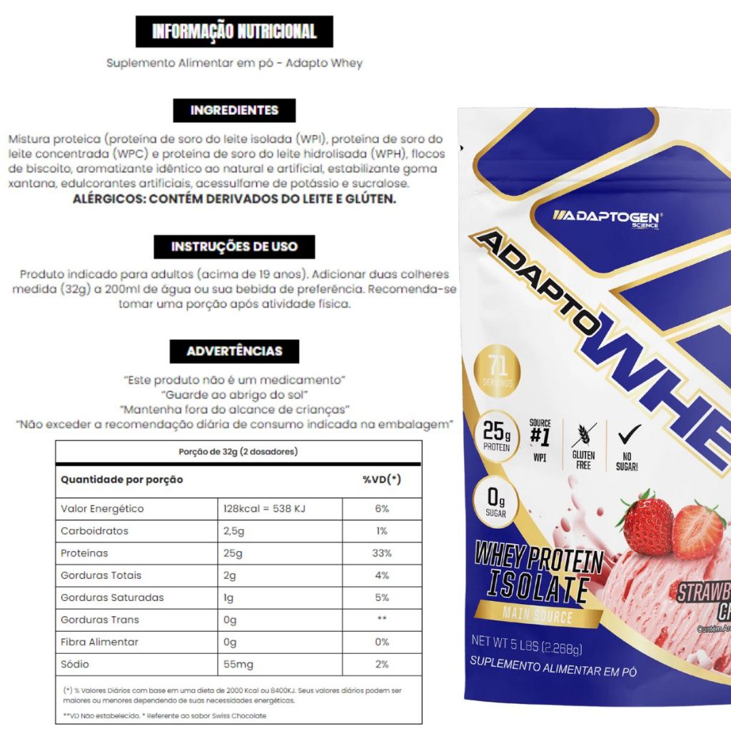 Produto Formado: 1un - ADAPTO 2240g (Diversos Sabores) DESCRIÇÃO O Adapto Whey 2240g da Adaptogen é um suplemento alimentar em pó que combina três tipos de proteínas do soro do leite: isolada (WPI), concentrada (WPC) e hidrolisada (WPH). Este produto é desenvolvido por meio de um processo avançado de microfiltração por fluxo cruzado (CFM), que resulta em uma proteína pura, com baixos níveis de carboidratos, gorduras e colesterol. Com um sabor inigualável, é ideal para aqueles que buscam aumentar a ingestão de proteínas de forma prática e saborosa. Benefícios • Alto Teor Proteico: Fornece 3 tipos de Whey para maximizar a absorção e os benefícios. • Rico em BCAA’s: Auxilia na recuperação muscular e no crescimento da massa magra. • Baixo em Calorias: Composição ideal para quem busca definição. • Preserva Frações de Proteína: Mantém propriedades benéficas como lactoferrina e glicomacropeptídeos. • Aumenta a Saciedade: Ajuda no controle do apetite. Como Usar Misture duas colheres medidoras (32g) do Adapto Whey em 240ml de água ou na bebida de sua preferência. Recomenda-se consumir uma porção imediatamente após a atividade física para melhores resultados. É indicado para adultos acima de 19 anos. Ingredientes Mistura proteica (proteína de soro do leite isolada, concentrada e hidrolisada), aroma natural de coco, cloreto de potássio, estabilizante goma xantana, edulcorantes artificiais (acessulfame de potássio e sucralose). ALÉRGICOS: Contém derivados do leite. O sabor Cookies contém glúten. Advertências Este produto não é um medicamento. Guarde ao abrigo do sol e mantenha fora do alcance de crianças. Não exceda a recomendação diária de consumo indicada na embalagem.
