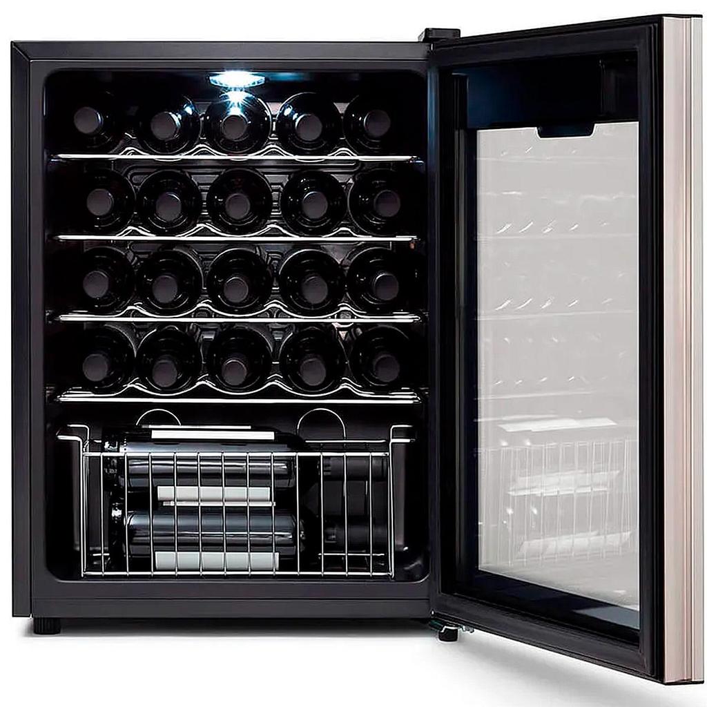 Adega Climatizada de Vinhos Midea 24 Garrafas com Painel Touch 220V Preto - WBB242 Se você é um apreciador de vinhos, vai adorar saber que a Adega 24 garrafas é o primeiro passo para começar a guardar suas bebidas de forma adequada, mantendo a qualidade e sabor. Com capacidade para até 24 garrafas, essa adega tem o tamanho ideal para guardar seus vinhos de forma organizada e na temperatura certa. E o melhor de tudo é que você pode controlar a temperatura através do painel Touch Control com controle digital, sem precisar abrir a porta e comprometer a refrigeração do ambiente interno. O design moderno da Adega 24 garrafas é um ponto forte. Com vidro transparente para facilitar a visualização da parte interna, iluminação em LED branco e acabamento em inox, ela combina com qualquer ambiente da casa. Além disso, as prateleiras cromadas são ergonômicas e muito mais resistentes, oferecendo a capacidade perfeita das garrafas. Outra vantagem é o ajuste de temperatura exata para cada tipo de vinho, de 5 a 18ºC. Isso é importante para manter a qualidade e sabor de cada bebida, sem perder as características. A Adega 24 garrafas ainda conta com puxador embutido na lateral da porta, pés niveladores para ajuste perfeito em qualquer tipo de piso, isolamento térmico e gás refrigerante ecologicamente correto (R600a livre de CFC). E para oferecer a segurança, a adega possui trava do painel, que impede o acionamento acidental ou o uso por crianças. Com tudo isso, a Adega 24 garrafas é uma escolha inteligente para quem quer começar a guardar seus vinhos de forma adequada e com estilo. Especificações Marca Midea Modelo WBB242 Voltagem 220V Cor Preto Capacidade 24 Garrafas Material Interno PSAI Material externo Aço galvanizado e vidro Inteligência Artificial Não Rodízios Não Pés niveladores Sim Número de portas 1 Características da porta Vidro duplo Iluminação em LED Sim Prateleiras removíveis Sim Painel eletrônico Sim Chave de segurança Sim Fechamento hermético Sim Variação de temperatura 5 a 18 Termostato Sim Termômetro digital Sim Controle de temperatura Sim Gás ecológico Sim Temperatura Mínima 5 Temperatura Máxima 18 Frequência (Hz) 60 Tipo de tomada 10 A Itens inclusos na embalagem 1 Adega e 1 manual Dimensão 64,2 x 49 x 44 cm Peso 26 kg INMETRO BRA19/02345 Imagens de caráter ilustrativo. Informações divulgadas de acordo com o manual do fabricante. Produto novo na caixa, lacrado com NF e garantia do fabricante de 12 meses. Em caso de dúvidas sobre informações técnicas, utilização, limitações e manuseio do produto, verifique o manual do fabricante. NAC016068 EAN7908198002994